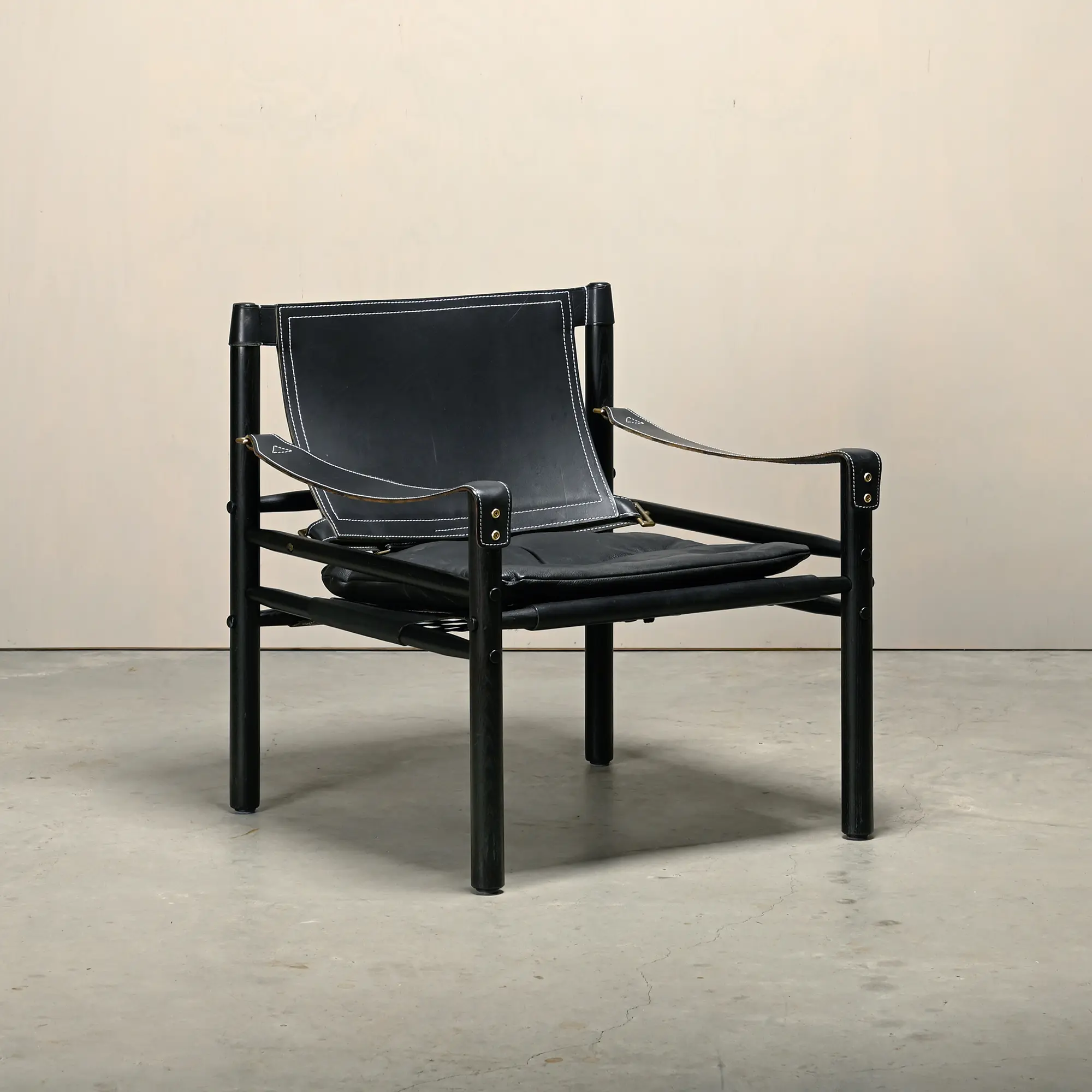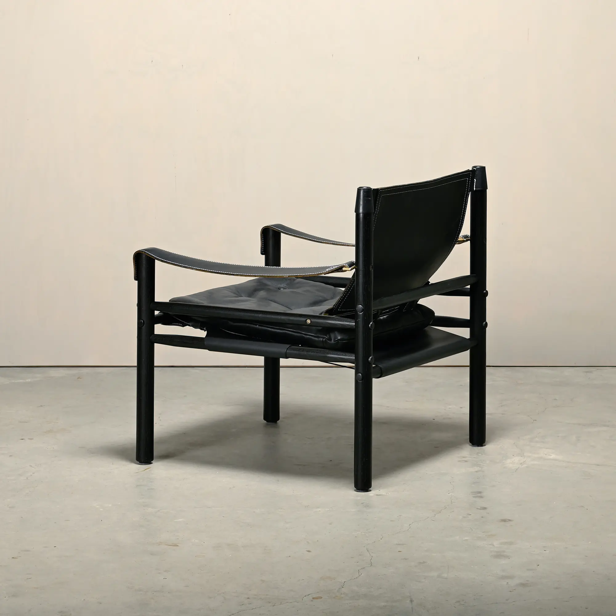 Sirocco Safari Lounge Chair designed by Arne Norell and manufactured by Norell Möbel AB in Sweden, 2000s. Solid black stained Ash wood frames with the black leather cushions. All in very good condition with minimal signs of use.