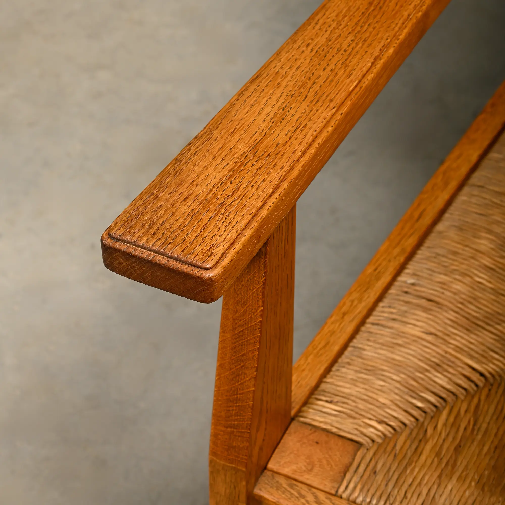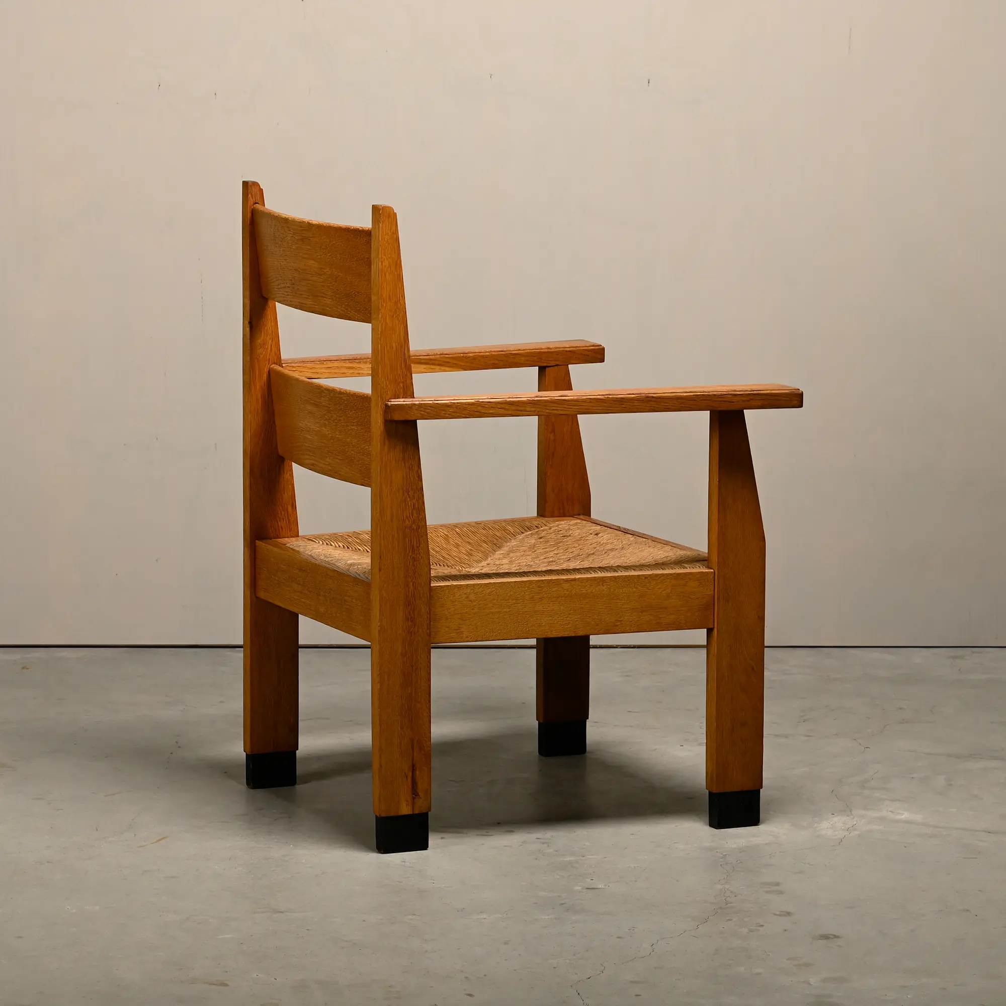 Art Deco Haagse School armchair, Netherlands, 1930s. Solid oak frame with straw seat. Very good original condition with only minor wear and tear.