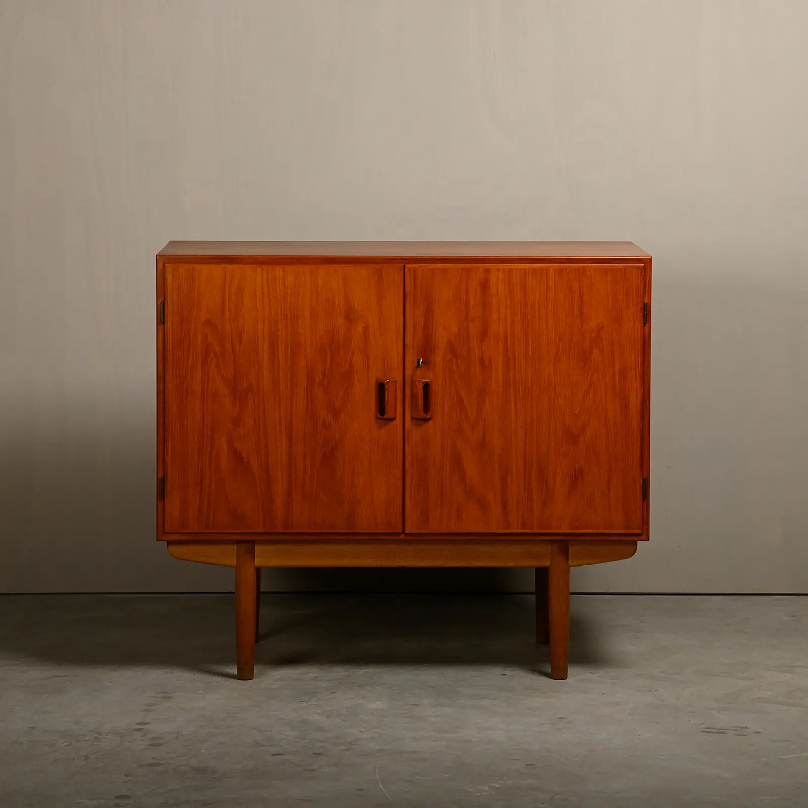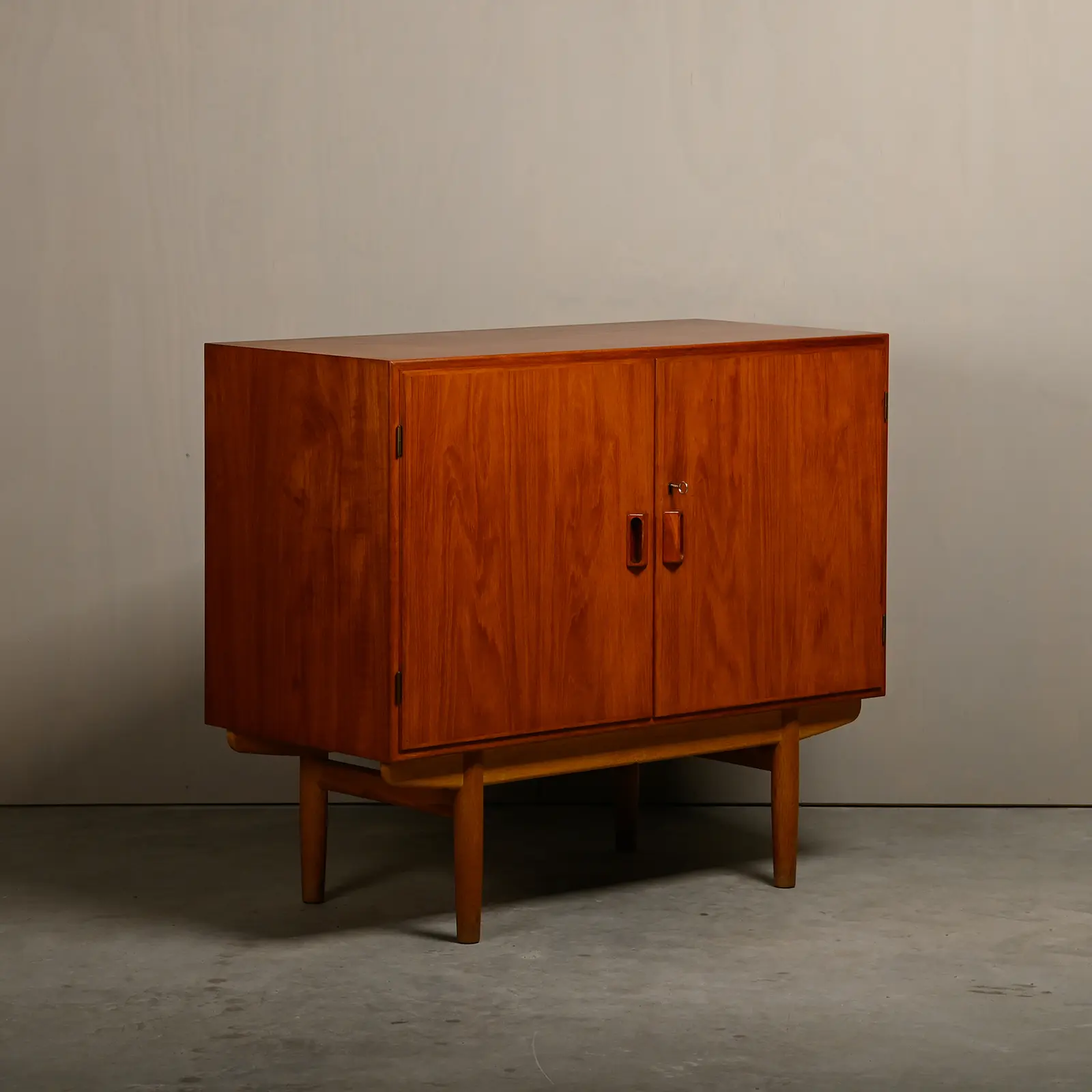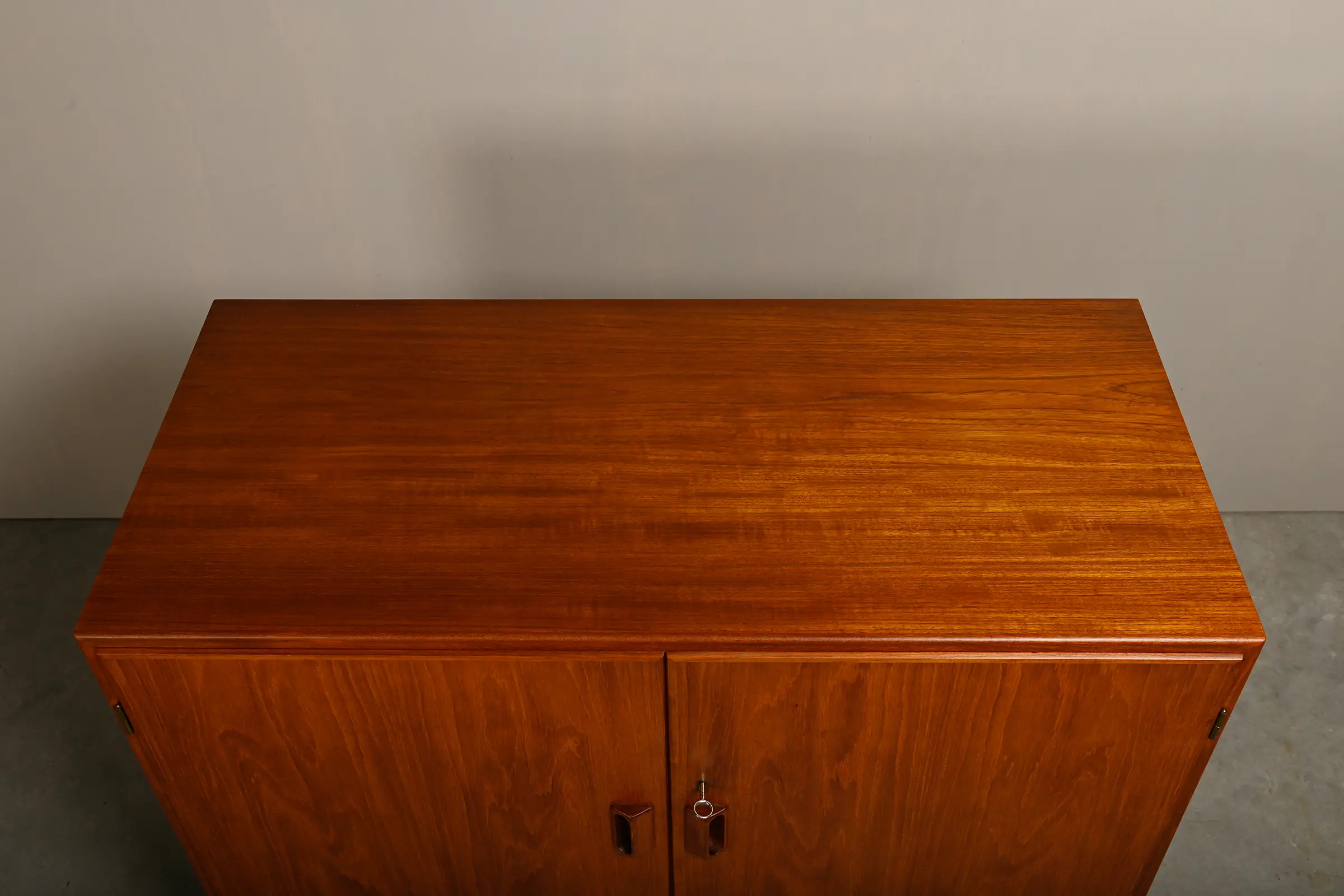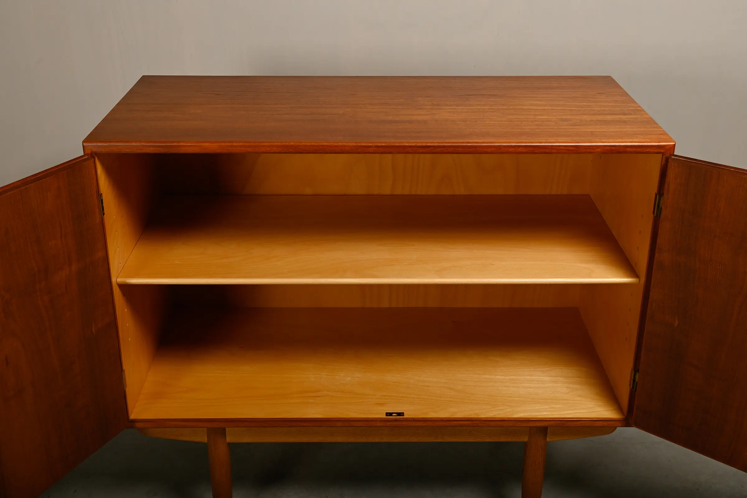 Small and early sideboard designed by Børge Mogensen and produced by Søborg Møbler, Denmark. Teak veneer body with an interior in light wood and one shelve. The doors can be locked with a key. This beautiful cabinet is in very good original condition with only minor traces of use. The teak wood is beautifully patinated and has a warm appearance. Labeled on the backside.