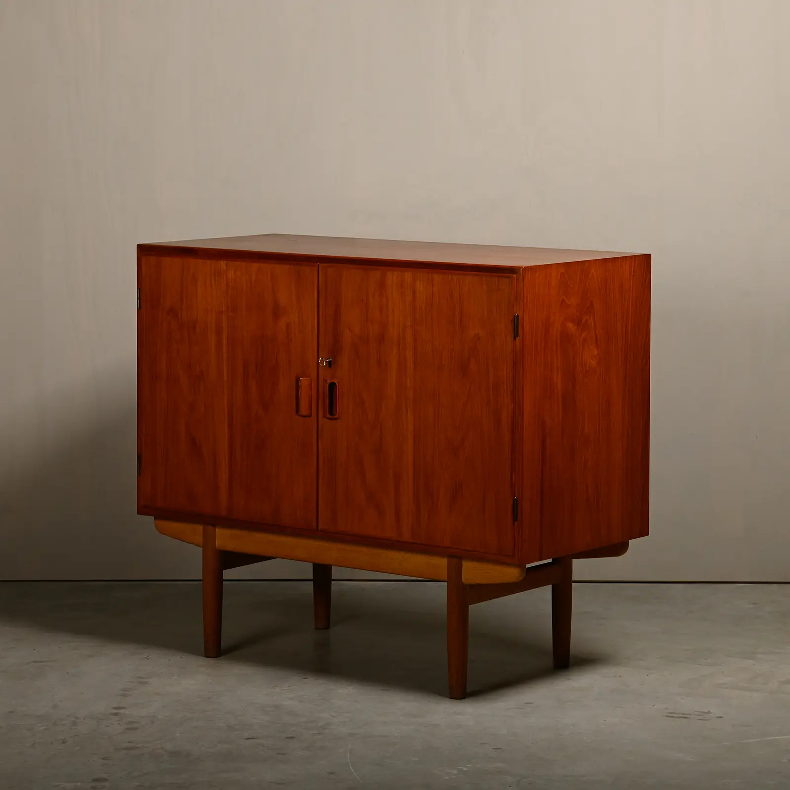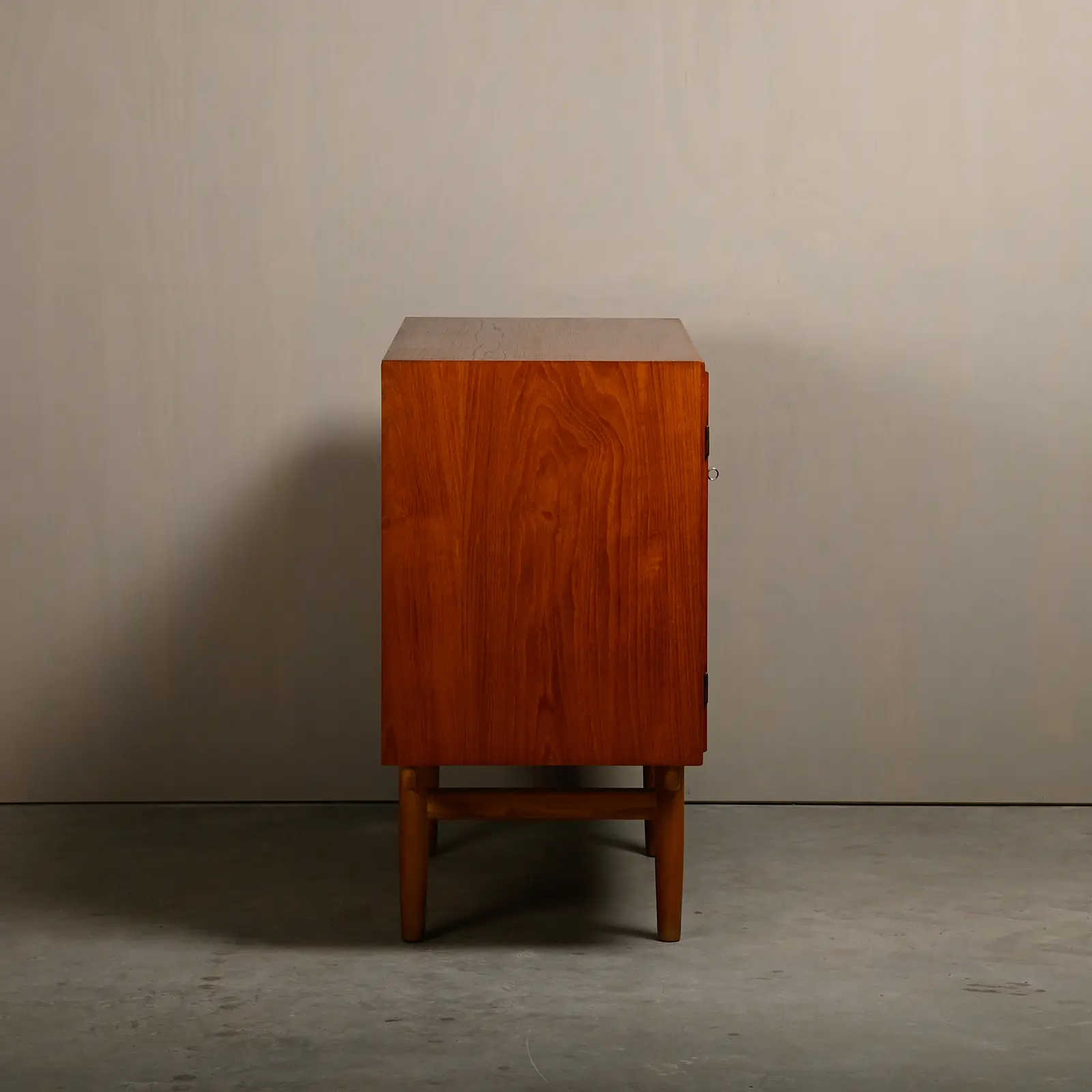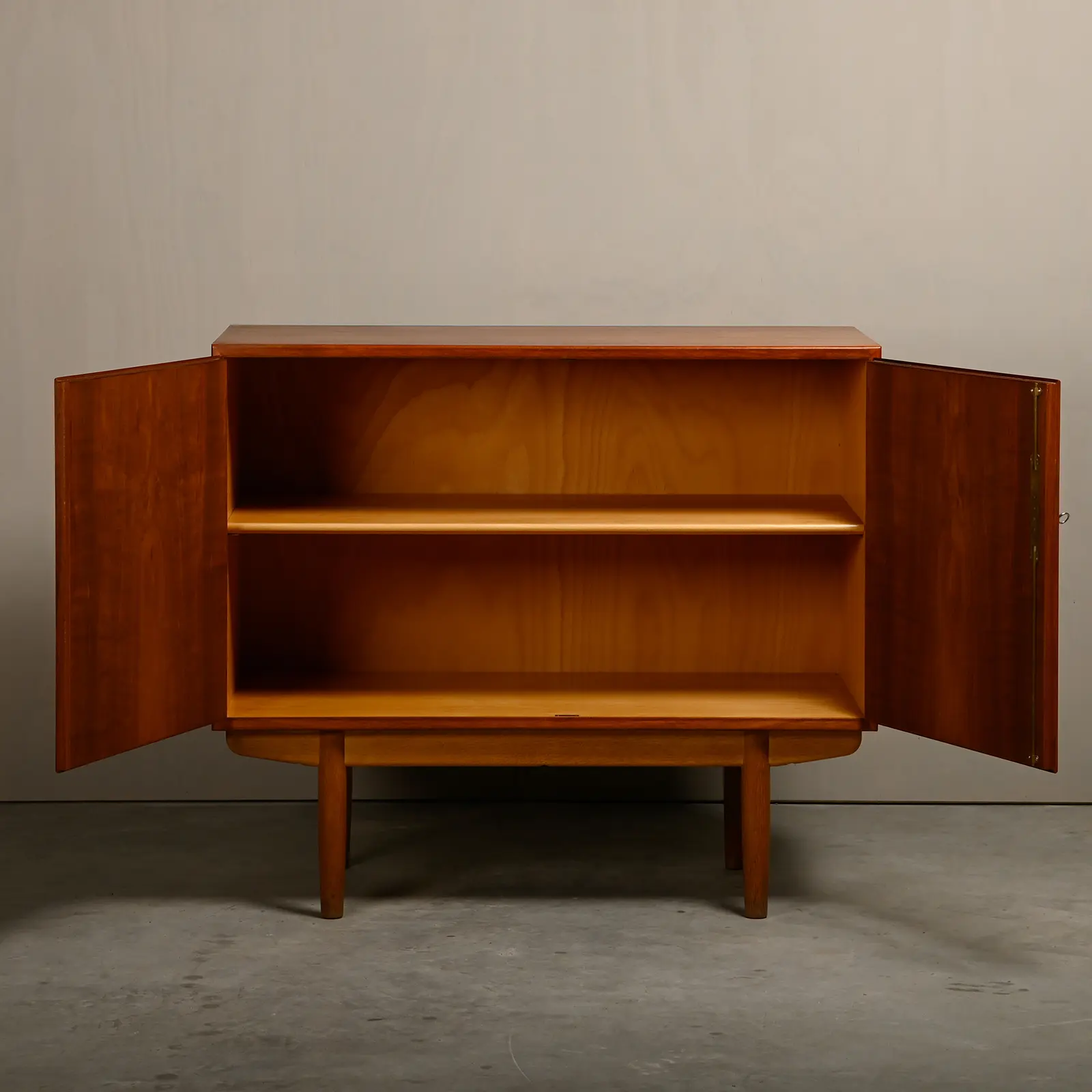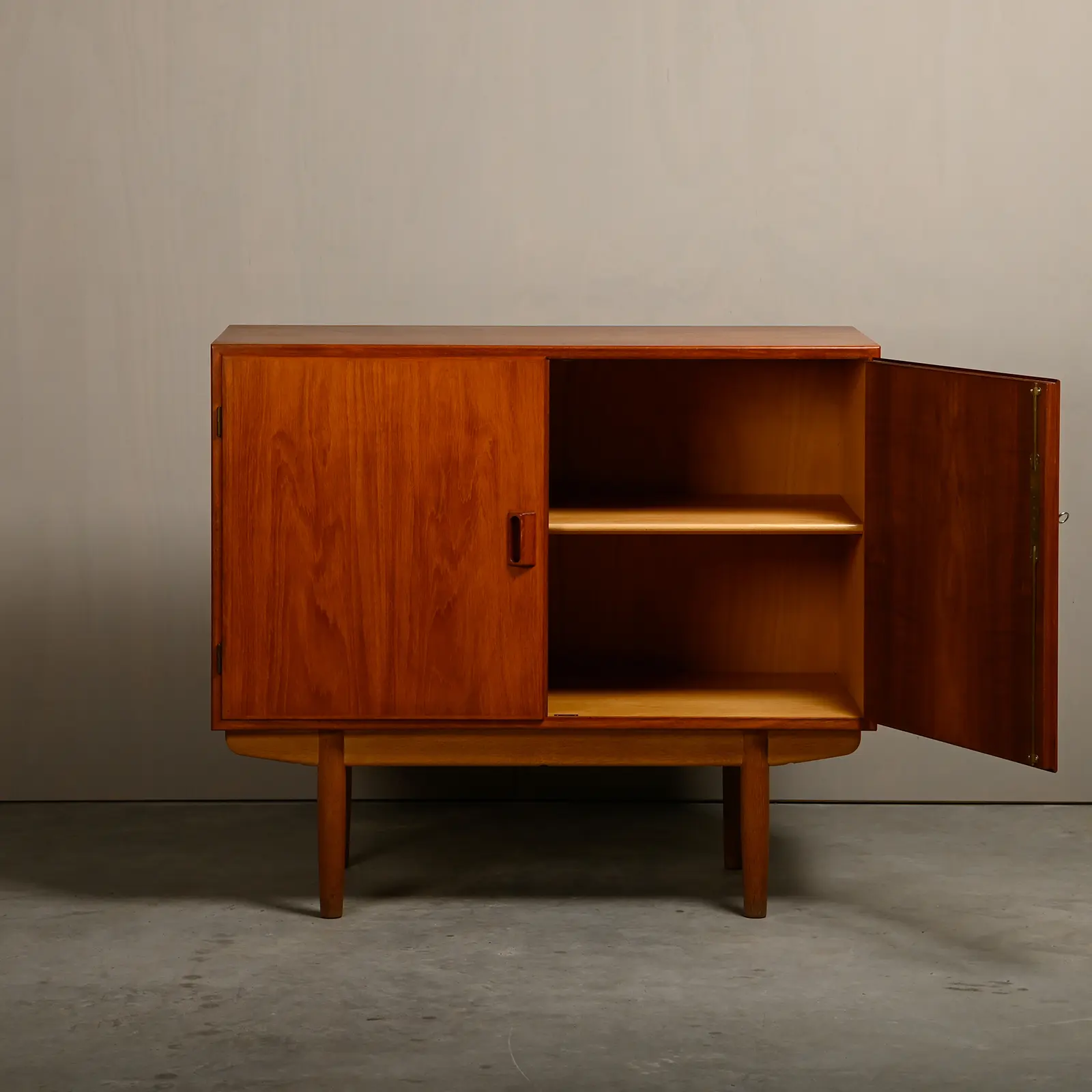 Small and early sideboard designed by Børge Mogensen and produced by Søborg Møbler, Denmark. Teak veneer body with an interior in light wood and one shelve. The doors can be locked with a key. This beautiful cabinet is in very good original condition with only minor traces of use. The teak wood is beautifully patinated and has a warm appearance. Labeled on the backside.