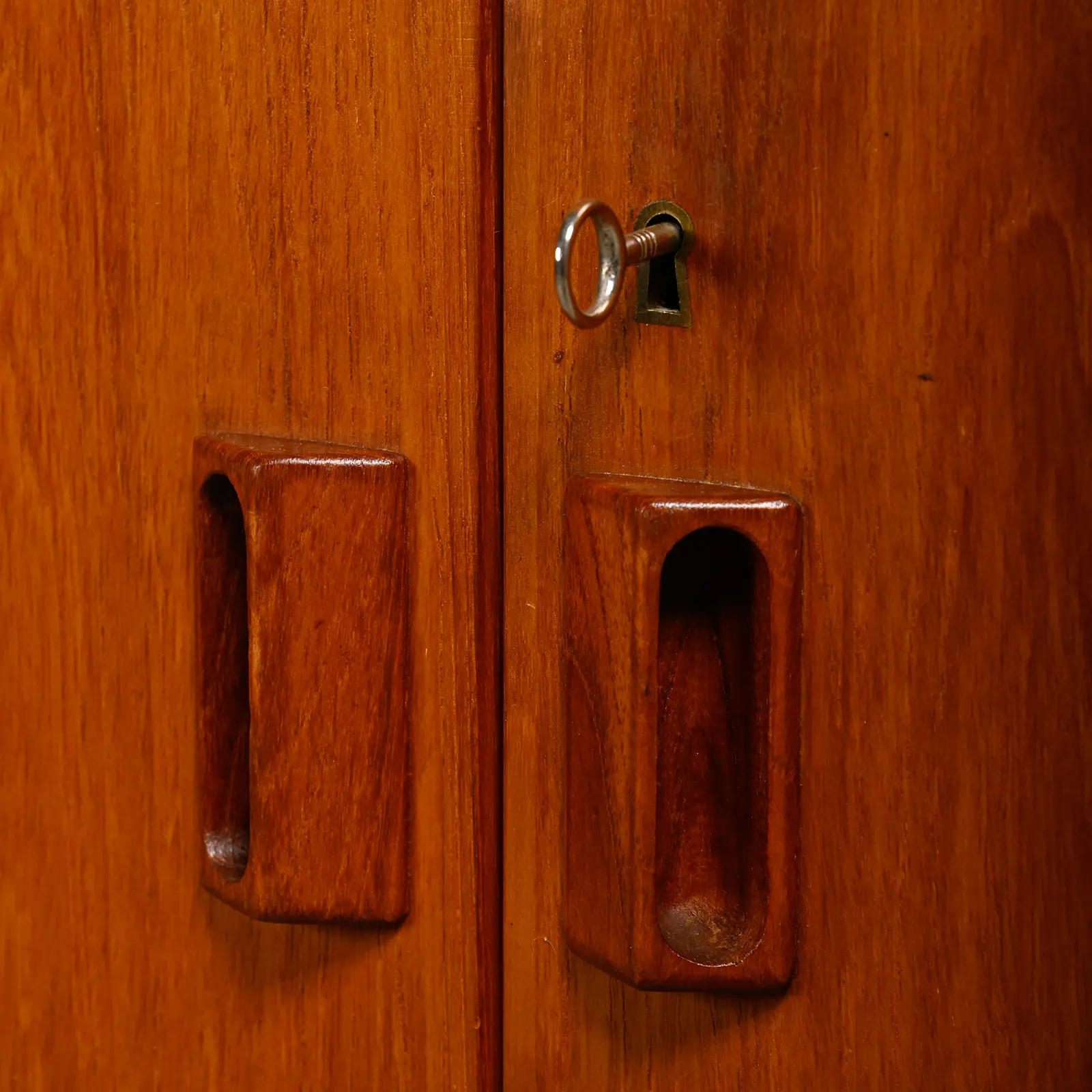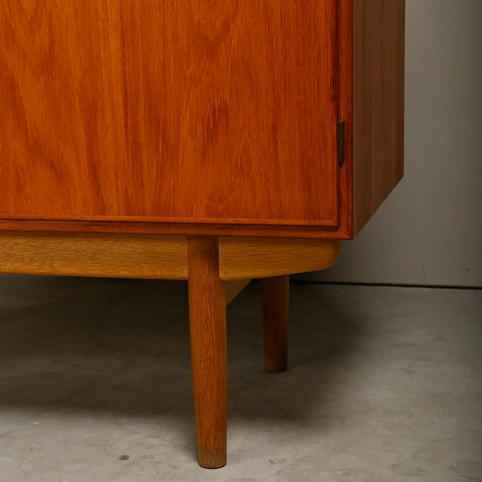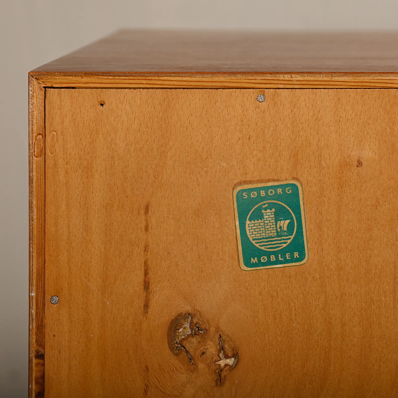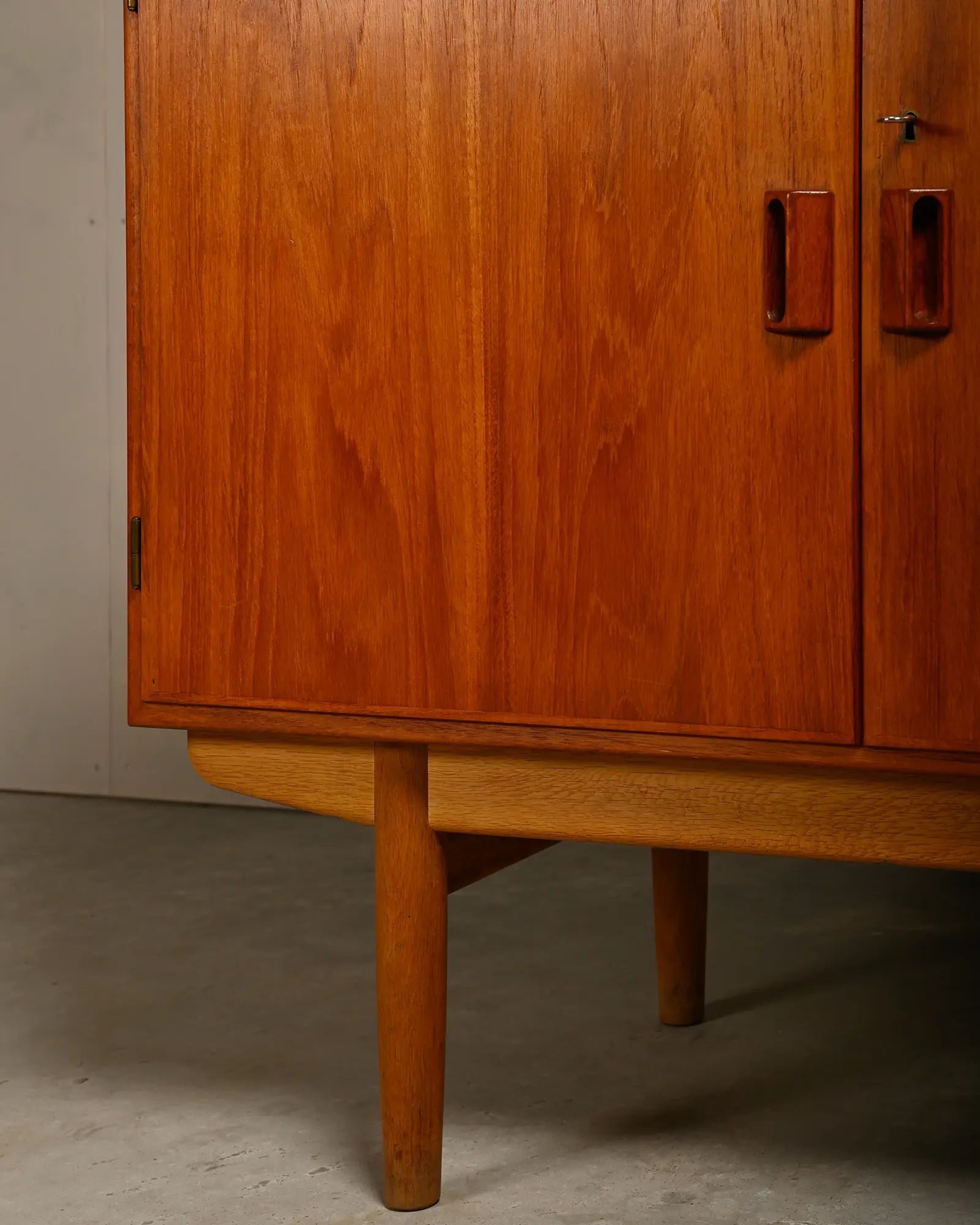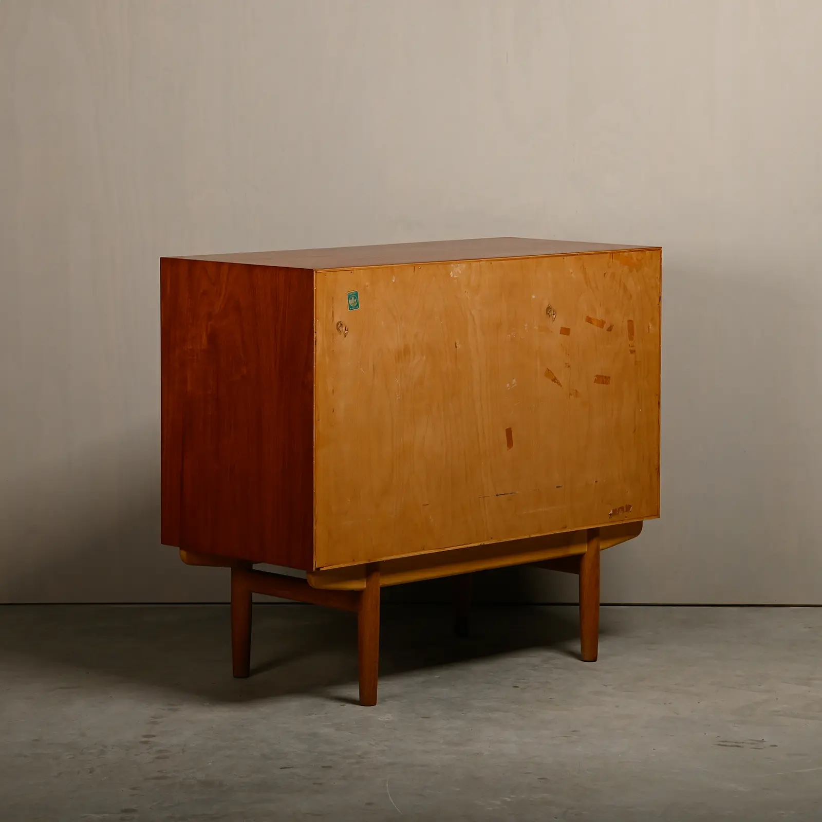 Small and early sideboard designed by Børge Mogensen and produced by Søborg Møbler, Denmark. Teak veneer body with an interior in light wood and one shelve. The doors can be locked with a key. This beautiful cabinet is in very good original condition with only minor traces of use. The teak wood is beautifully patinated and has a warm appearance. Labeled on the backside.