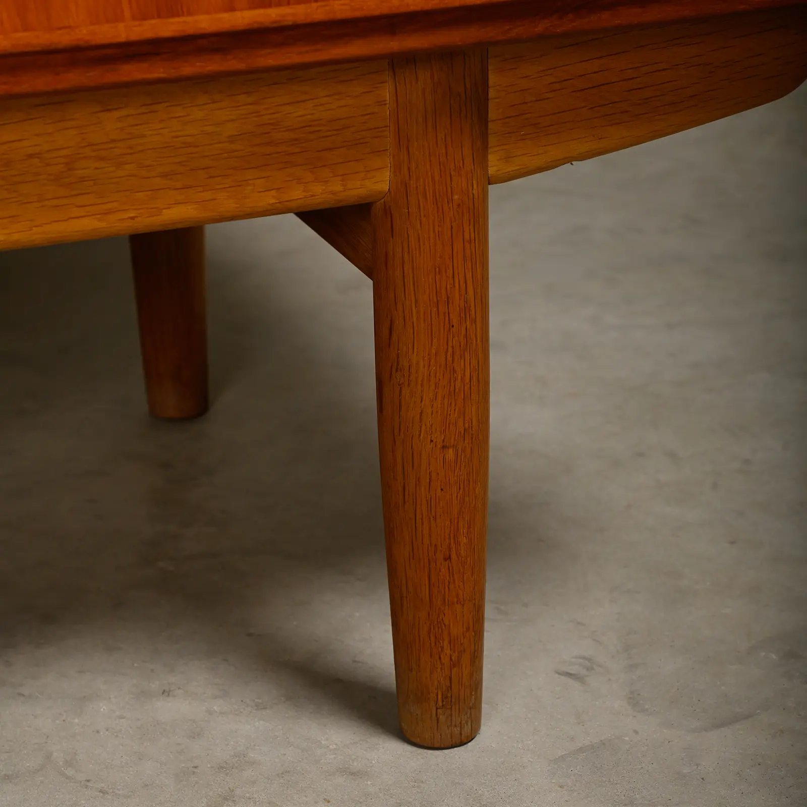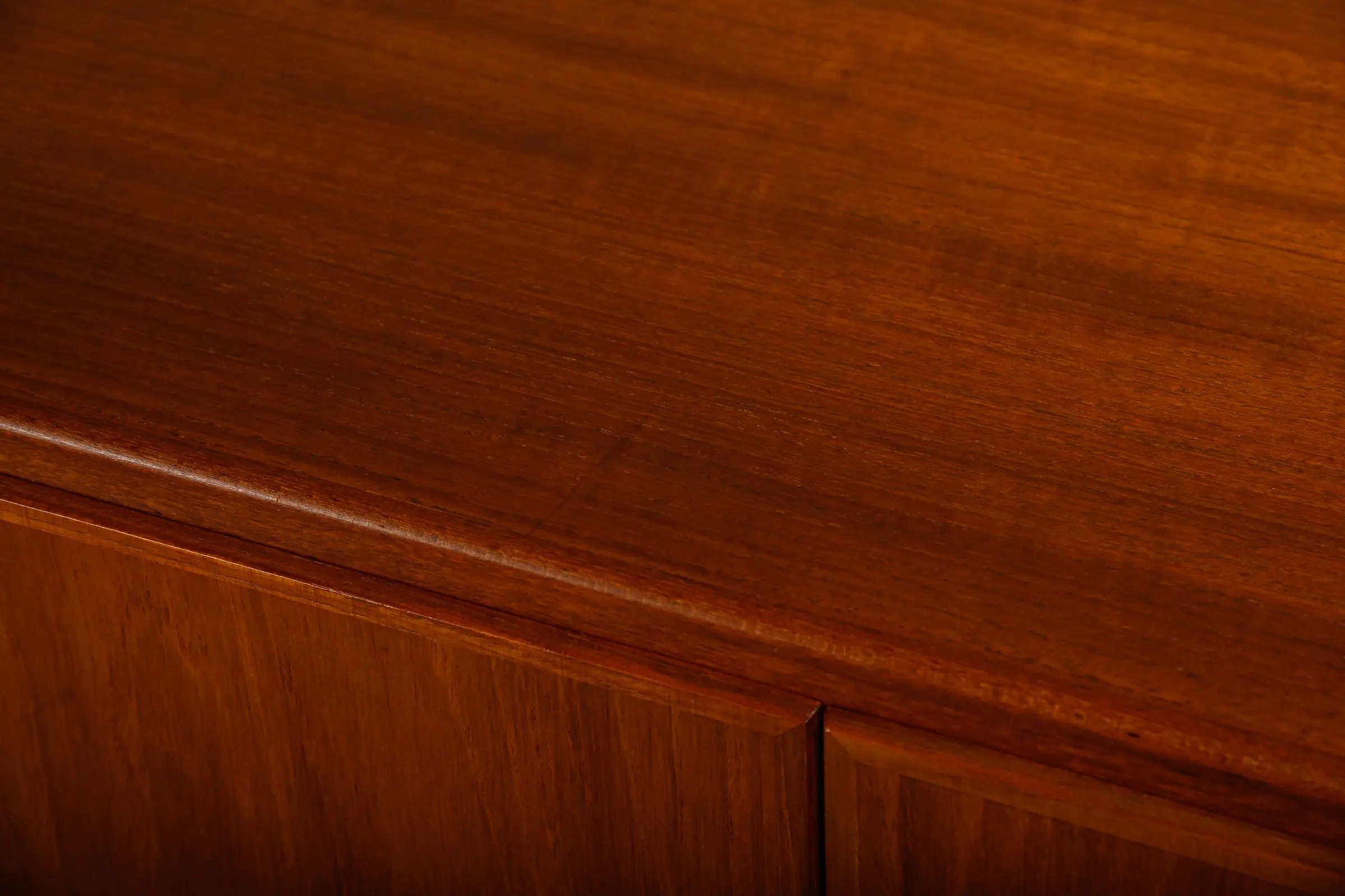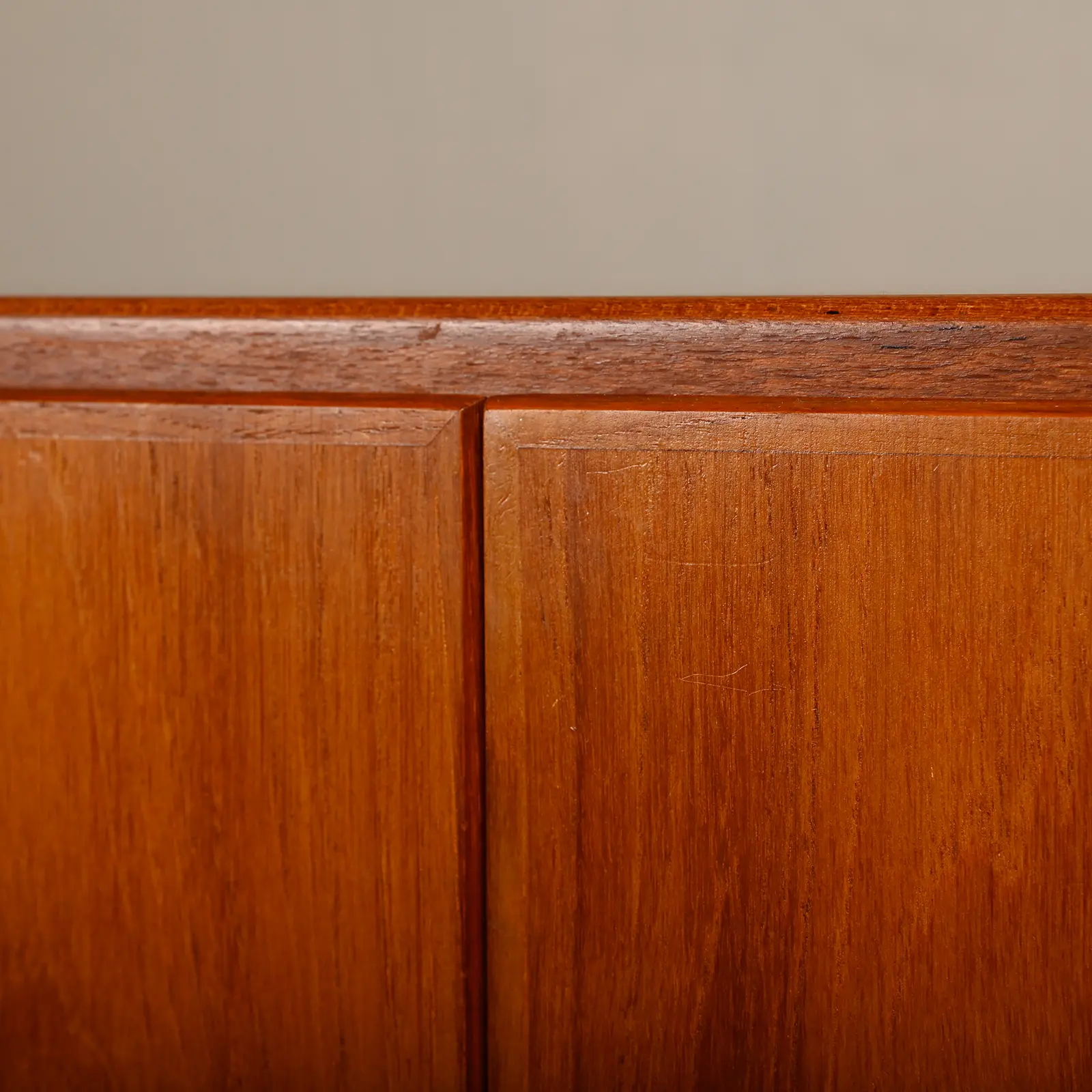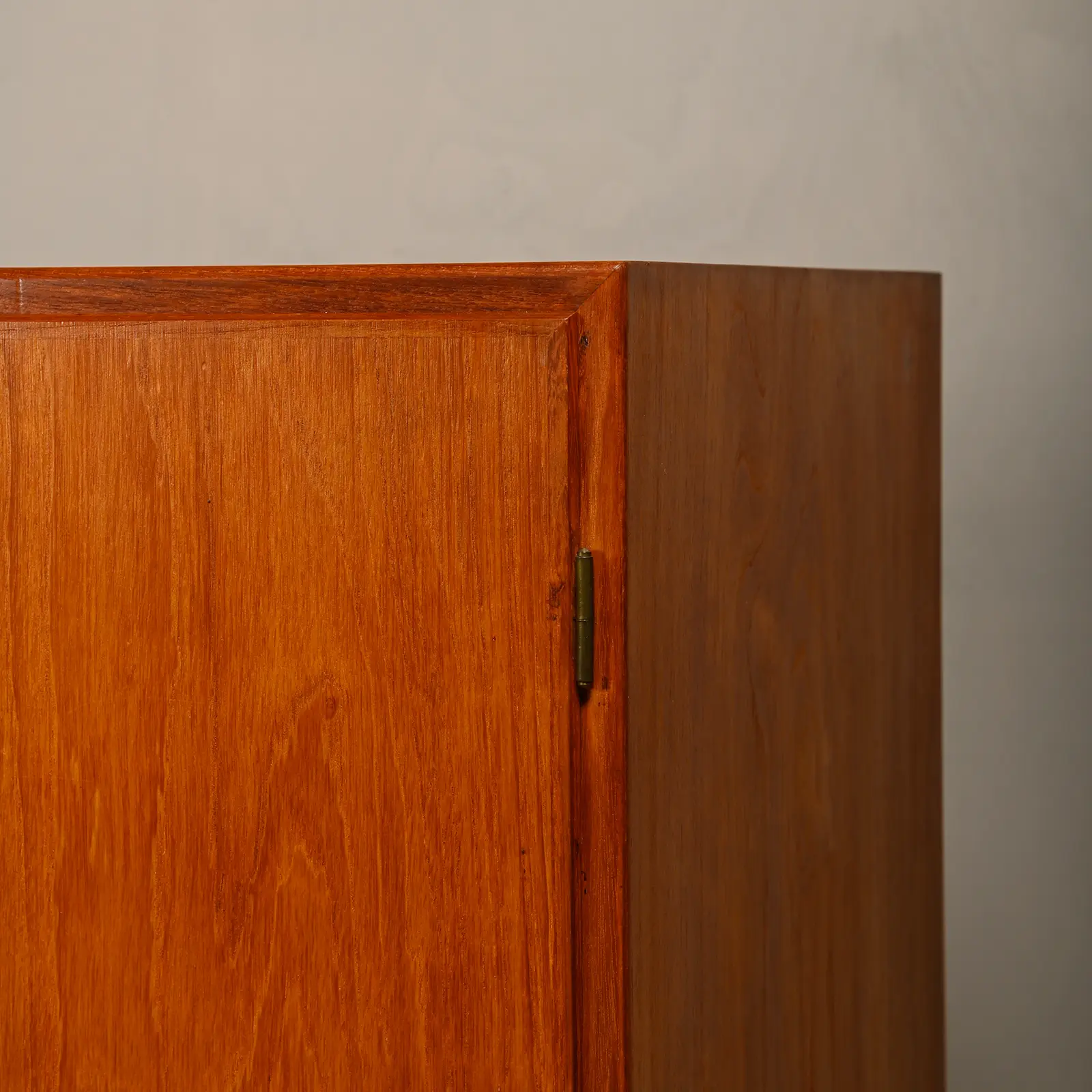 Small and early sideboard designed by Børge Mogensen and produced by Søborg Møbler, Denmark. Teak veneer body with an interior in light wood and one shelve. The doors can be locked with a key. This beautiful cabinet is in very good original condition with only minor traces of use. The teak wood is beautifully patinated and has a warm appearance. Labeled on the backside.