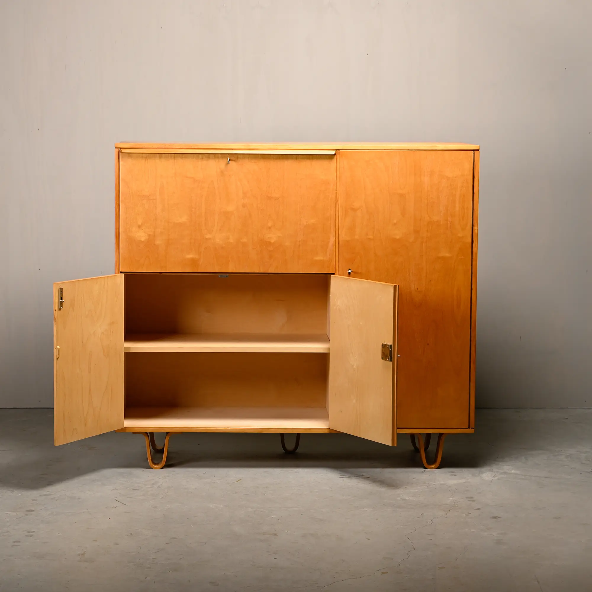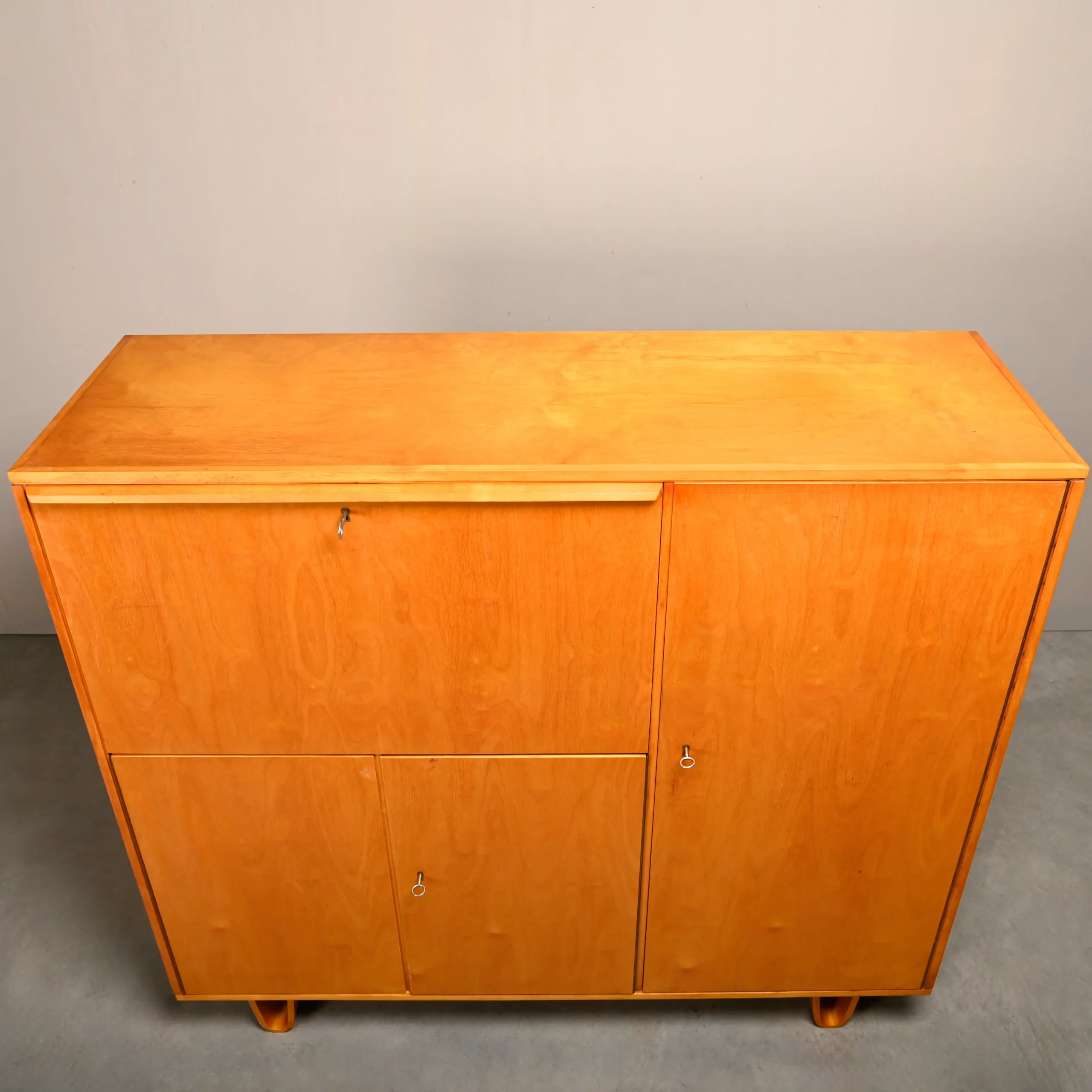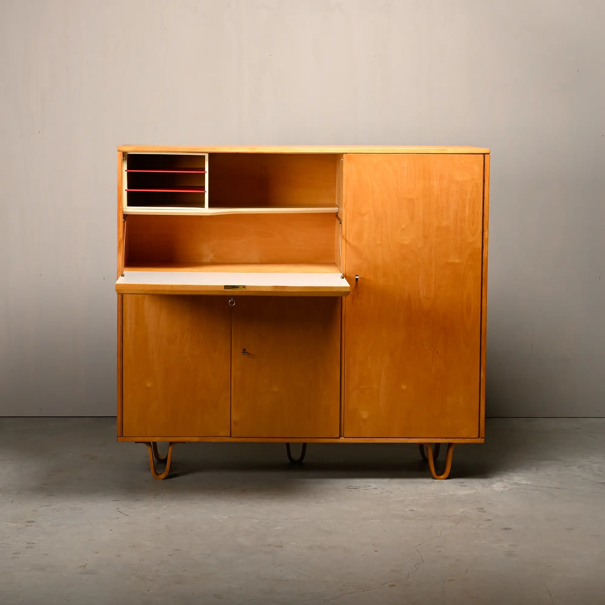 Secretaire / Highboard Model CB01 designed by Cees Braakman and manufactured by Pastoe in the 1960s, Netherlands. This Secretaire / Highboard was part of the ‘Birch Series’ of Pastoe and inspired by the new molded plywood technics that came available in the mid 1940s. The birch plywood highboard consists of three compartments, one with a writing area (laminated worktop) and two storage compartments with shelves and two drawers. In very good vintage condition with minor wear and normal signs of use and age. Three keys are included.