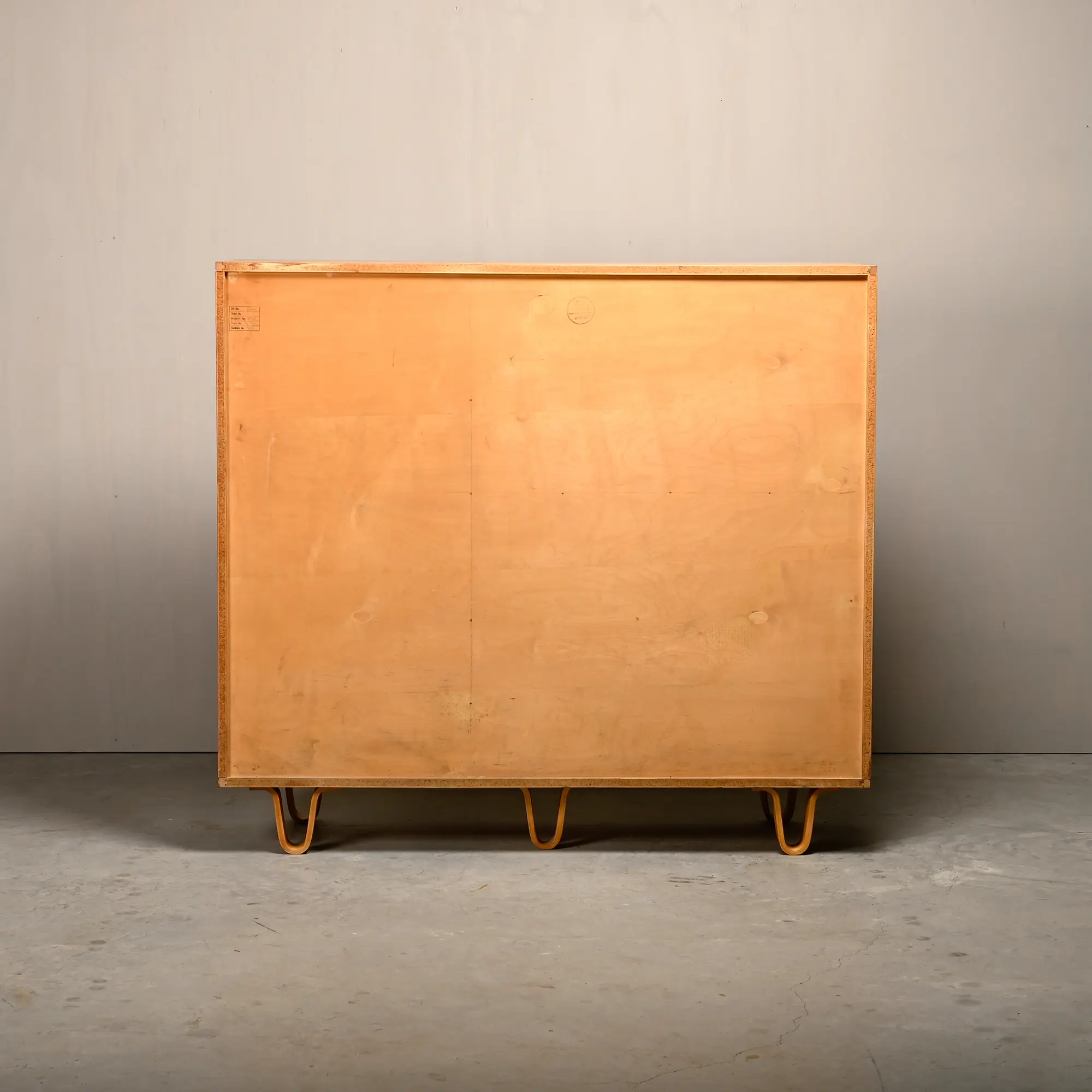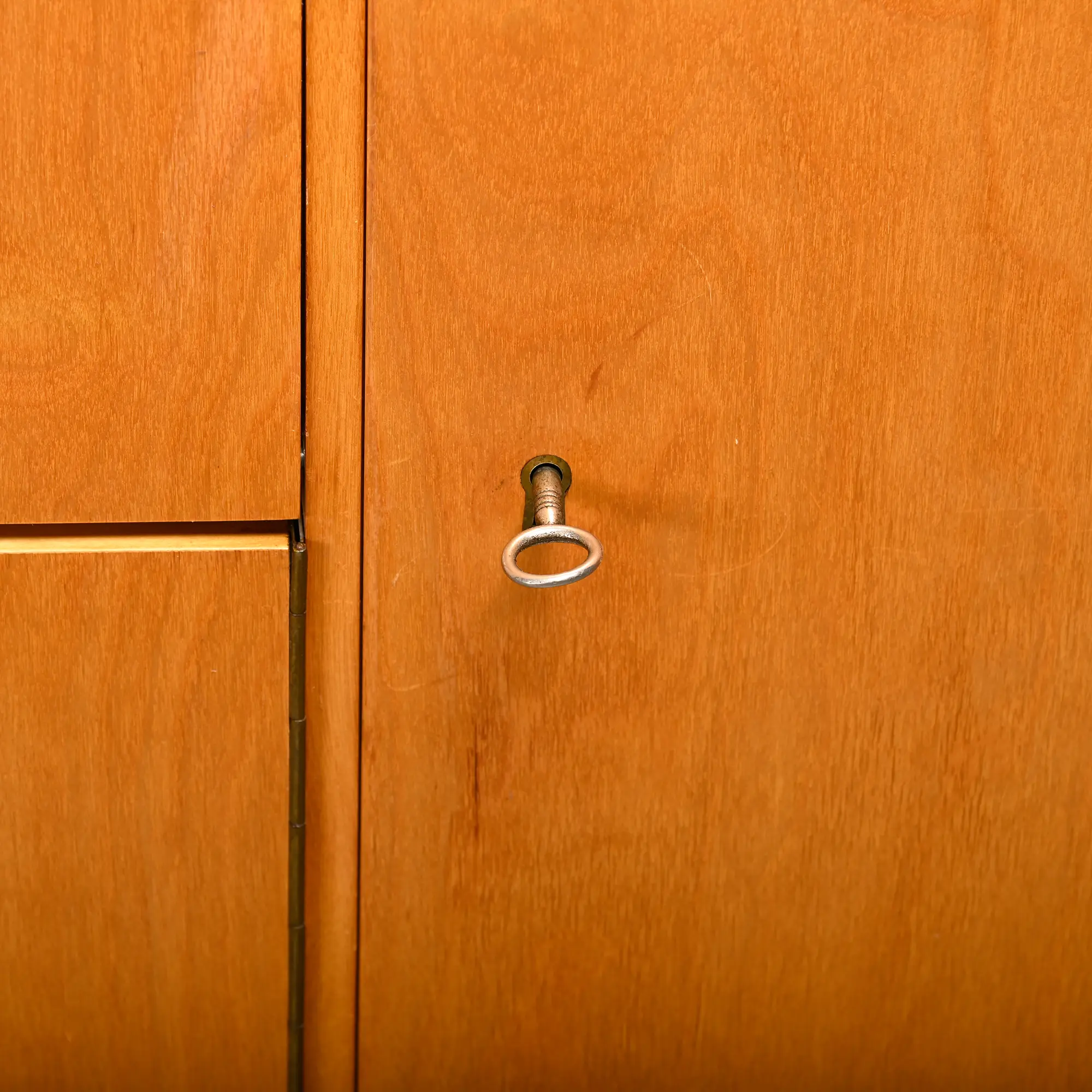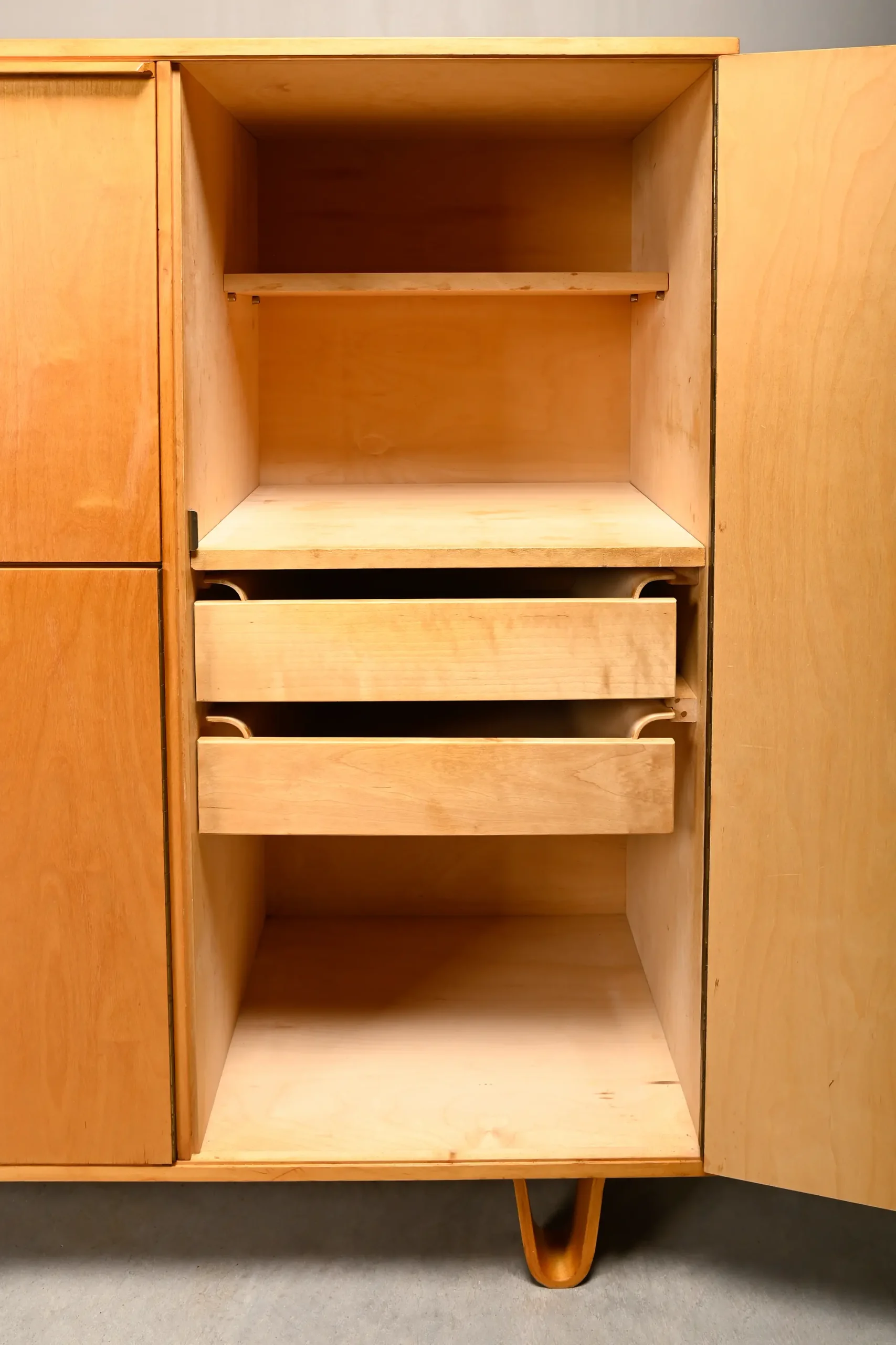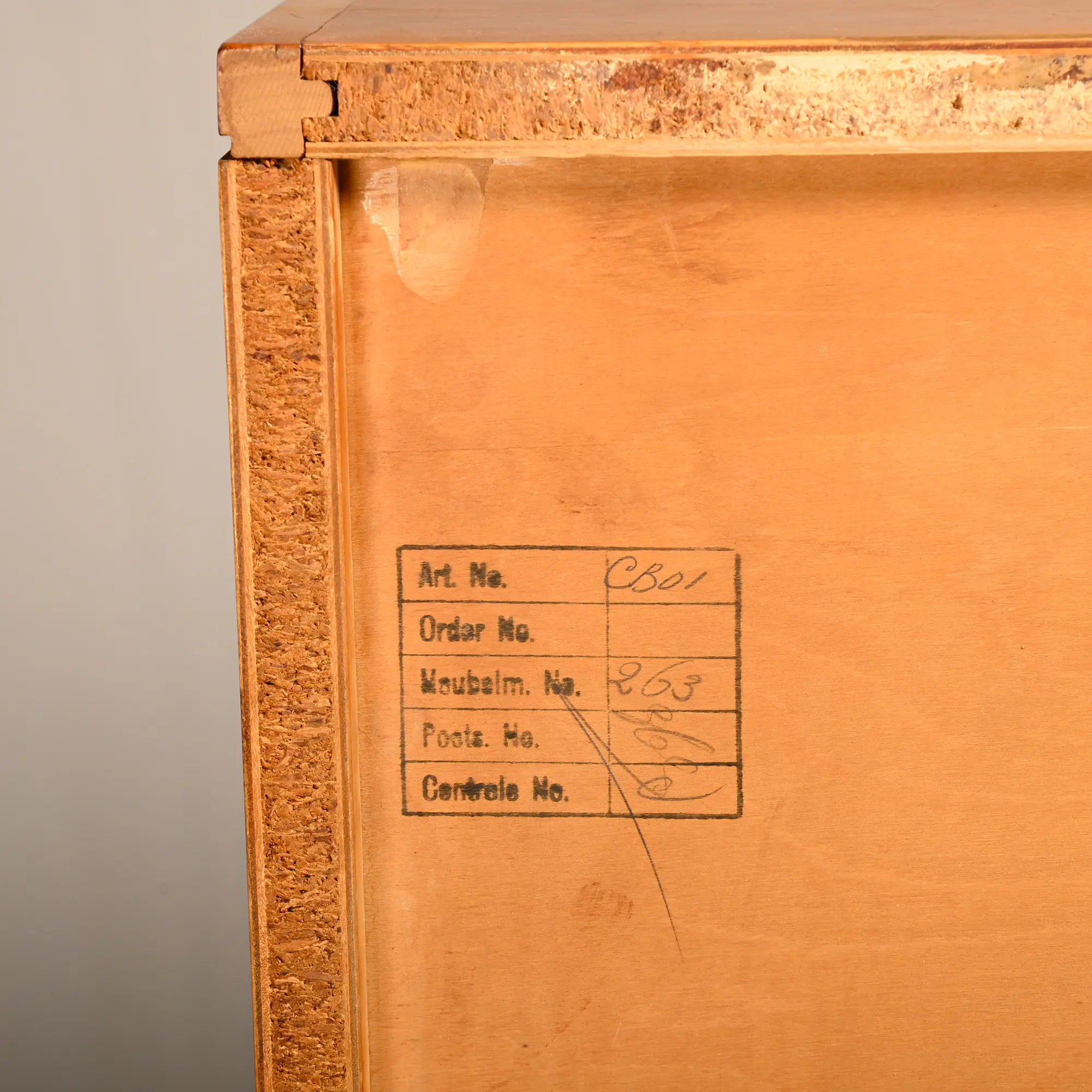 Secretaire / Highboard Model CB01 designed by Cees Braakman and manufactured by Pastoe in the 1960s, Netherlands. This Secretaire / Highboard was part of the ‘Birch Series’ of Pastoe and inspired by the new molded plywood technics that came available in the mid 1940s. The birch plywood highboard consists of three compartments, one with a writing area (laminated worktop) and two storage compartments with shelves and two drawers. In very good vintage condition with minor wear and normal signs of use and age. Three keys are included.