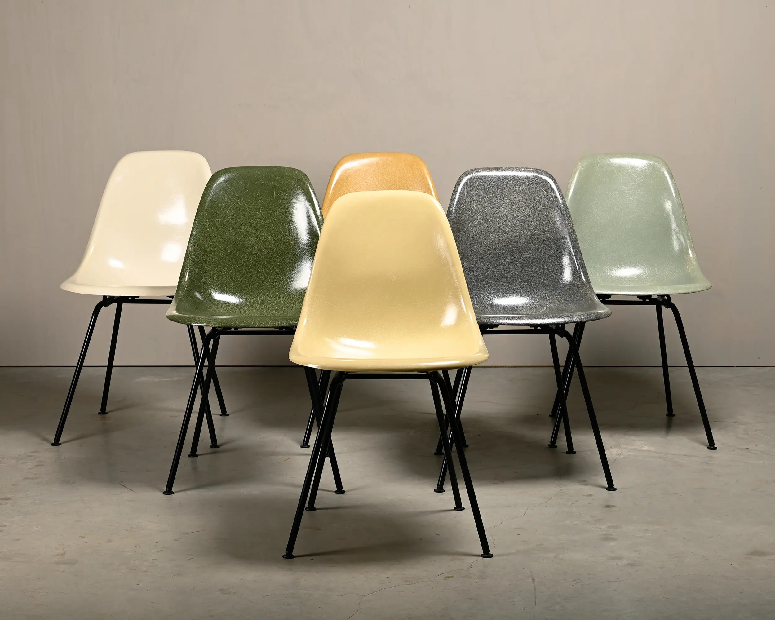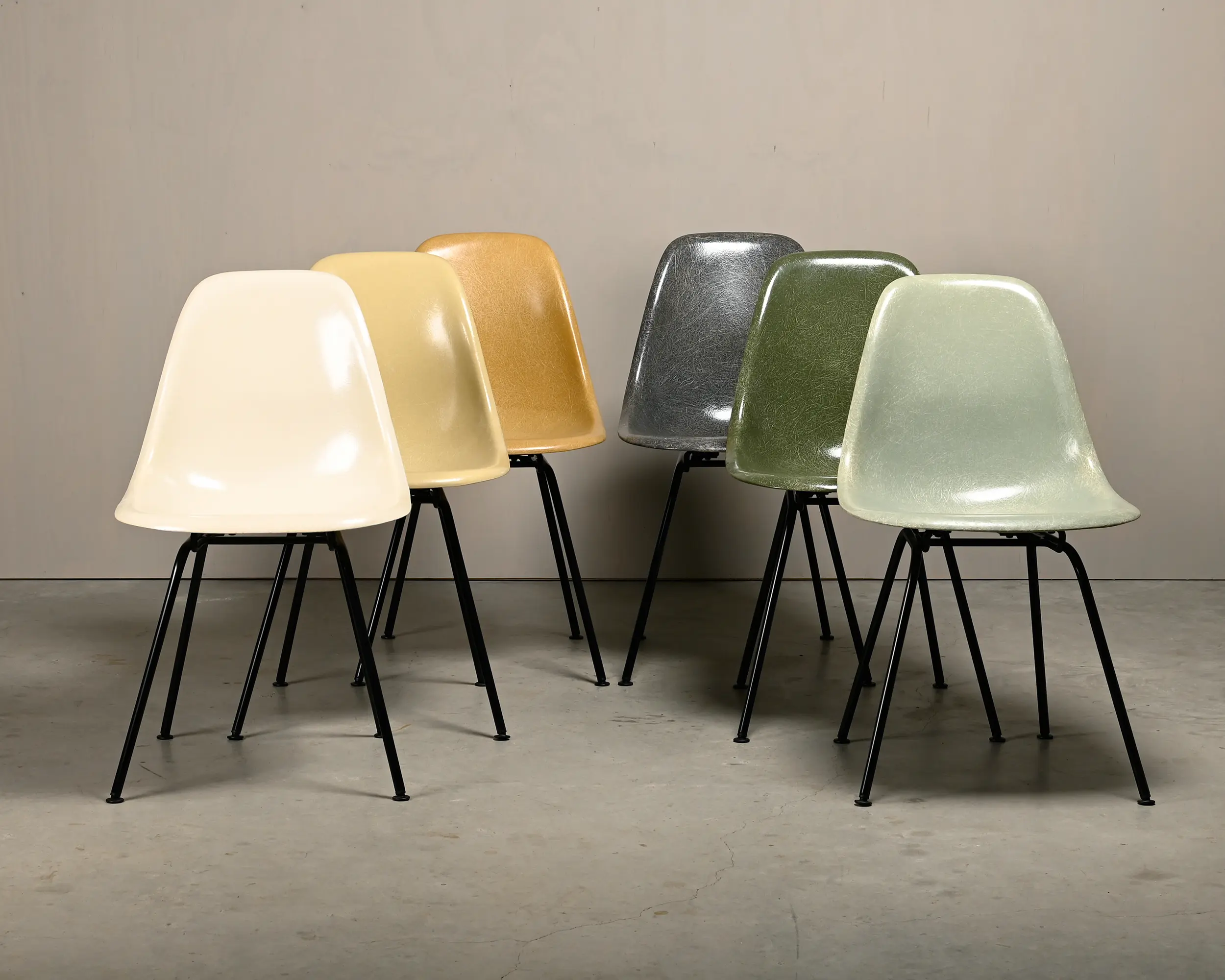 Iconic side chairs designed by Charles and Ray Eames for Herman Miller and Vitra. Molded fiberglass shells in the colours: Parchment, Ochre Light, Grey Yellow, Olive Green Dark, Sea Foam Green and Elephant Hide Grey. Assembled on newly powder coated original H-bases in basic dark. The chairs are in very good vintage condition with small signs of wear. The shock mounts (rubbers) and floor glides are replaced. The shells can be dated to between 1960 – 1980 and all are signed by manufacture. The shells can also be assambled with other original bases at request.