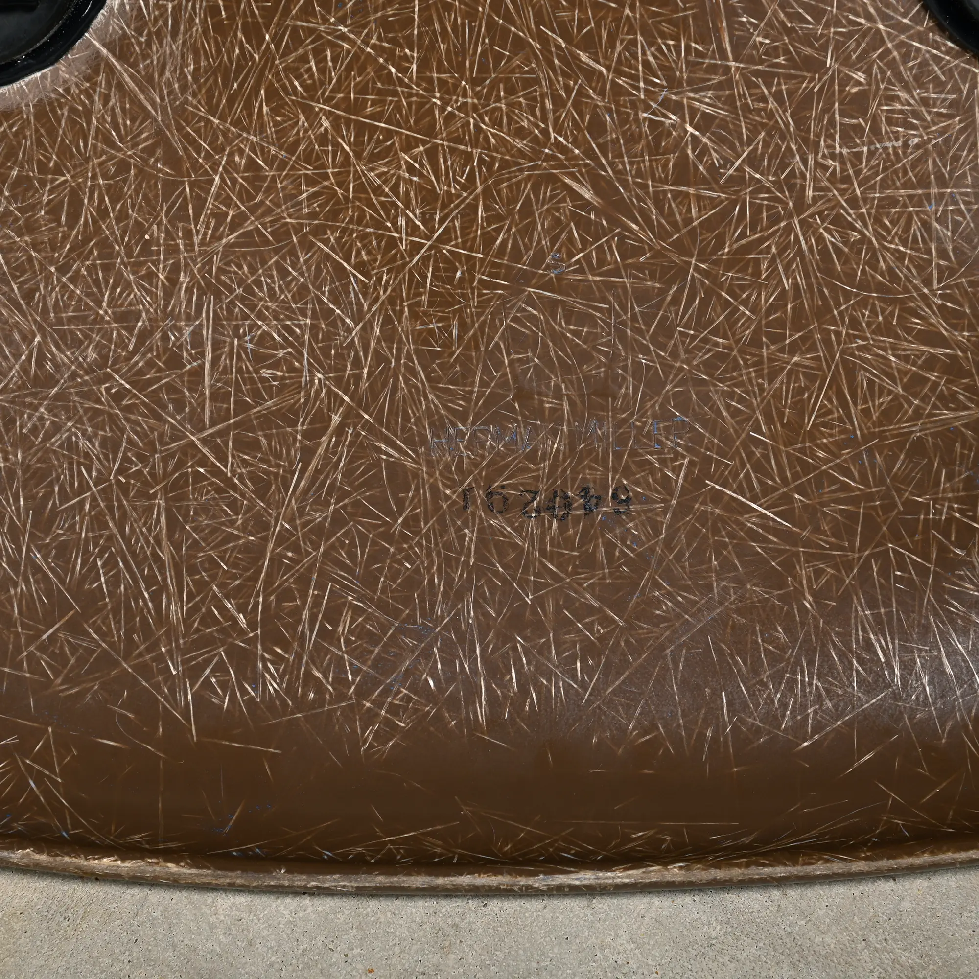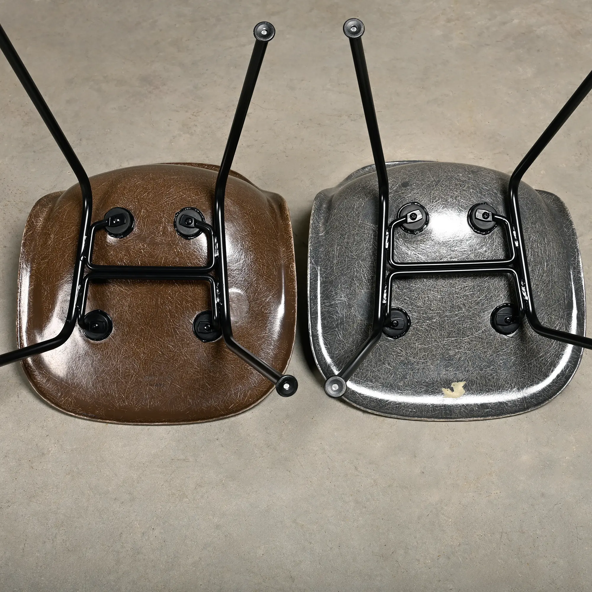 Iconic side chairs designed by Charles and Ray Eames for Herman Miller and Vitra. Molded fiberglass shells in the colours: Seal Brown, Elephant Hide Grey, Parchment and Ochre Light. Assembled on newly powder coated bases in basic dark. The chairs are in very good vintage condition with small signs of wear. The shock mounts (rubbers) and floor glides are replaced. The shells can be dated to between 1960 – 1980 and all are signed by manufacture. The shells can also be assambled with other original bases at request.