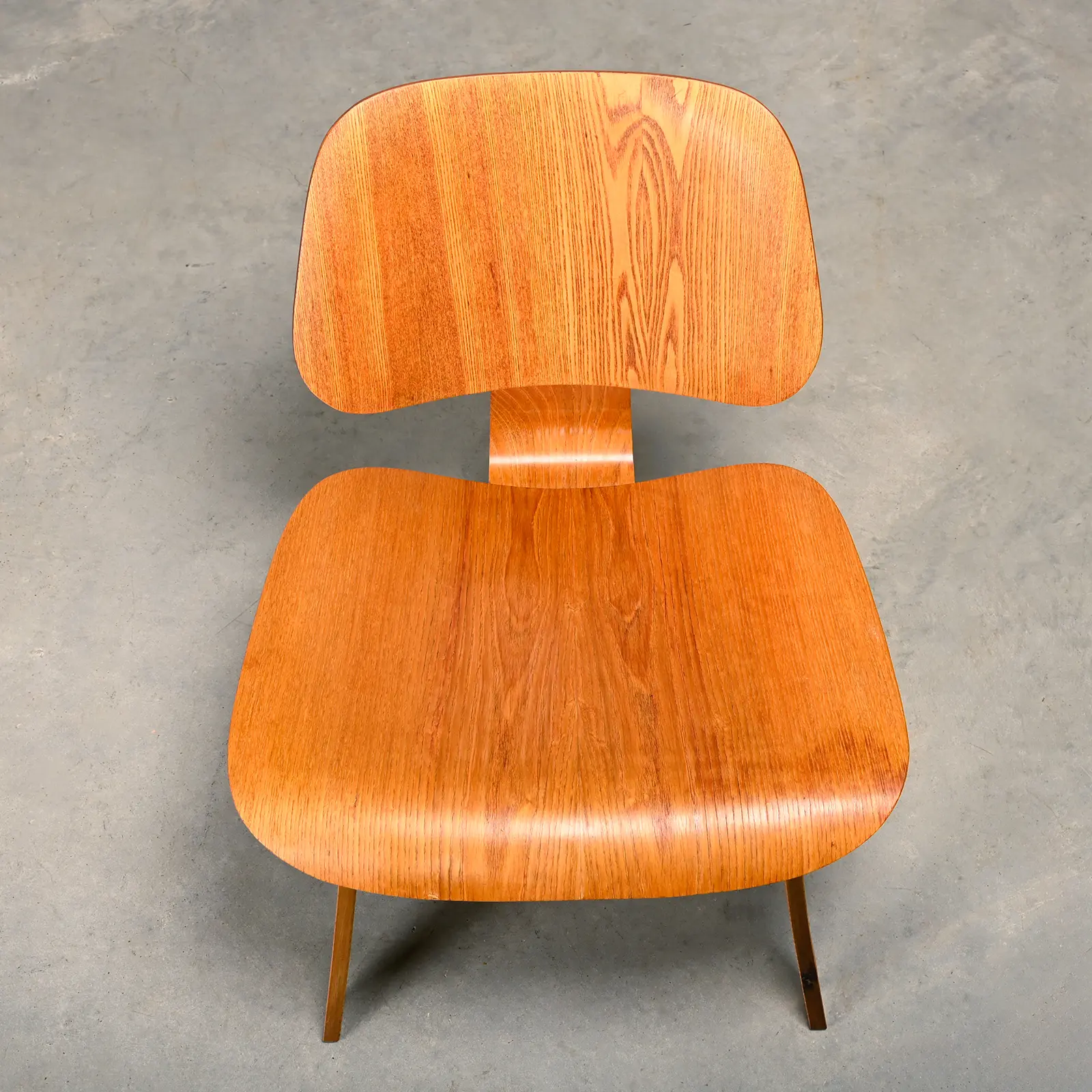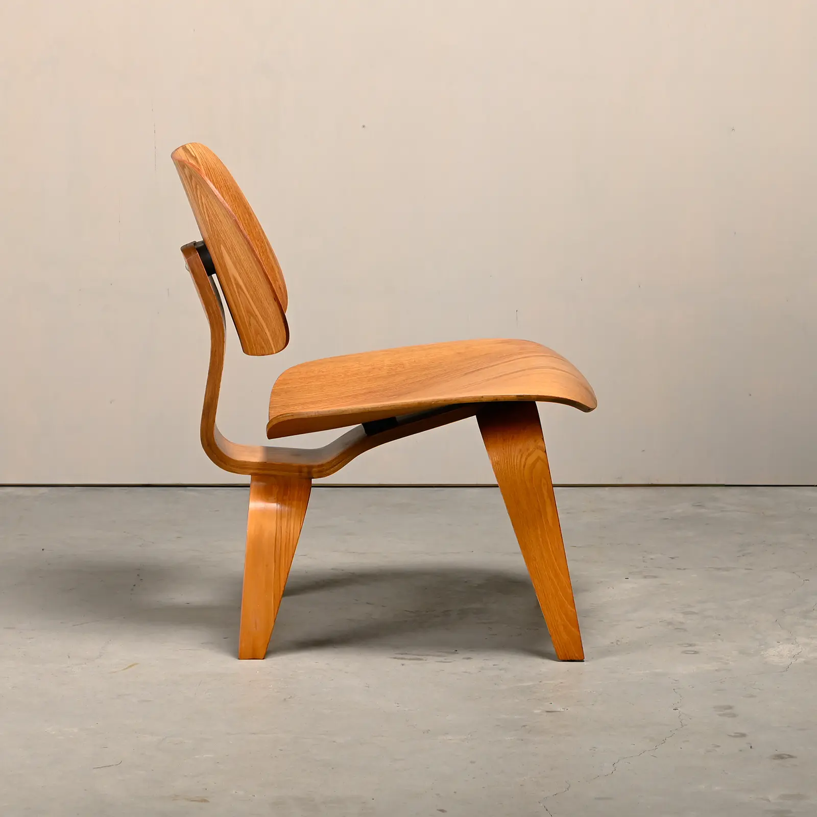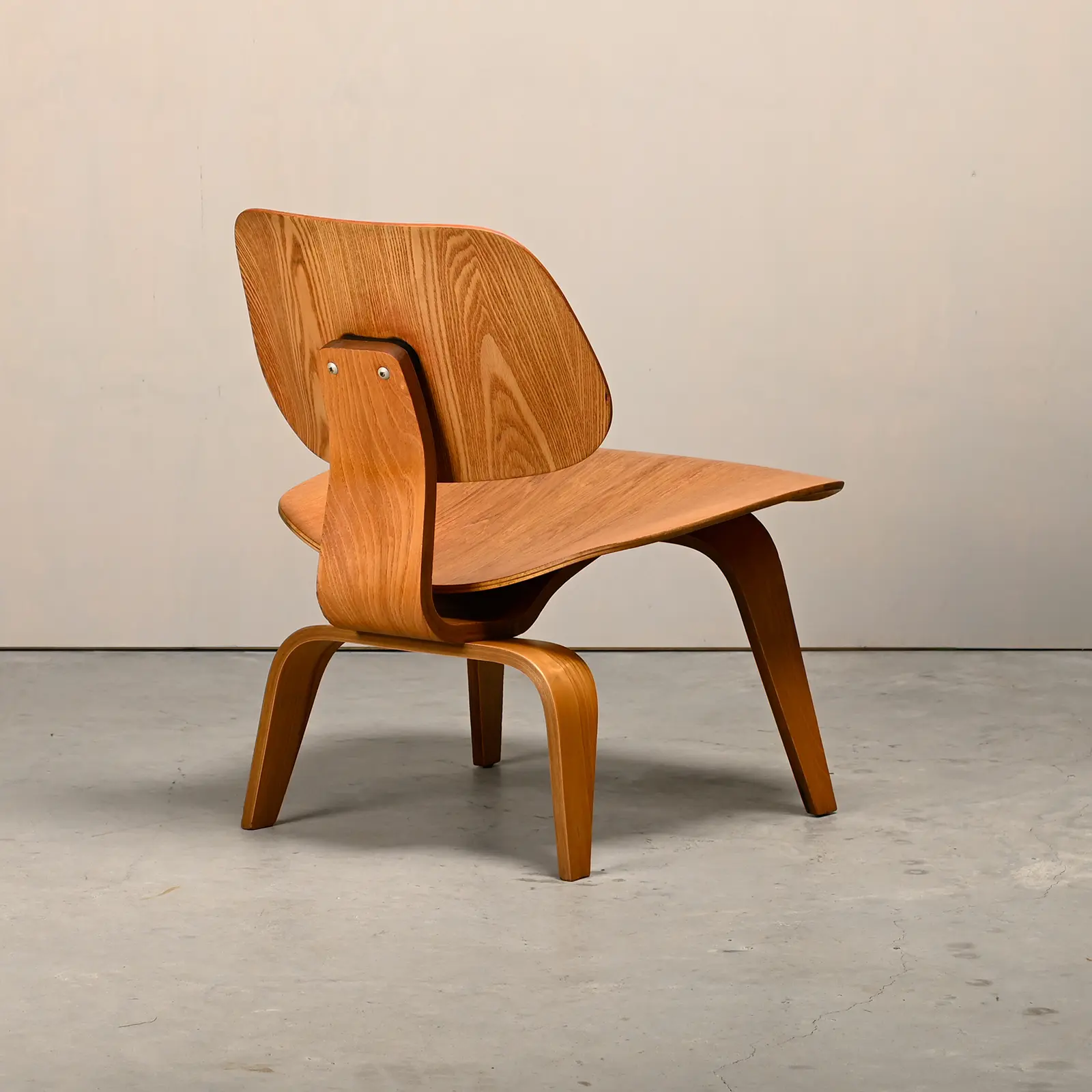 Iconic Charles & Ray Eames LCW lounge chair in Ash plywood. Early Herman Miller production from the fifties (5-2-5 screw configuration), just after Herman Miller took over production from Evans Products Company, Moulded Plywood division. The chair is in good condition with minor visible wear and ageing (light scratches). The back panel has been restored in the past. Beautiful aged wood grain with warm colour tone.