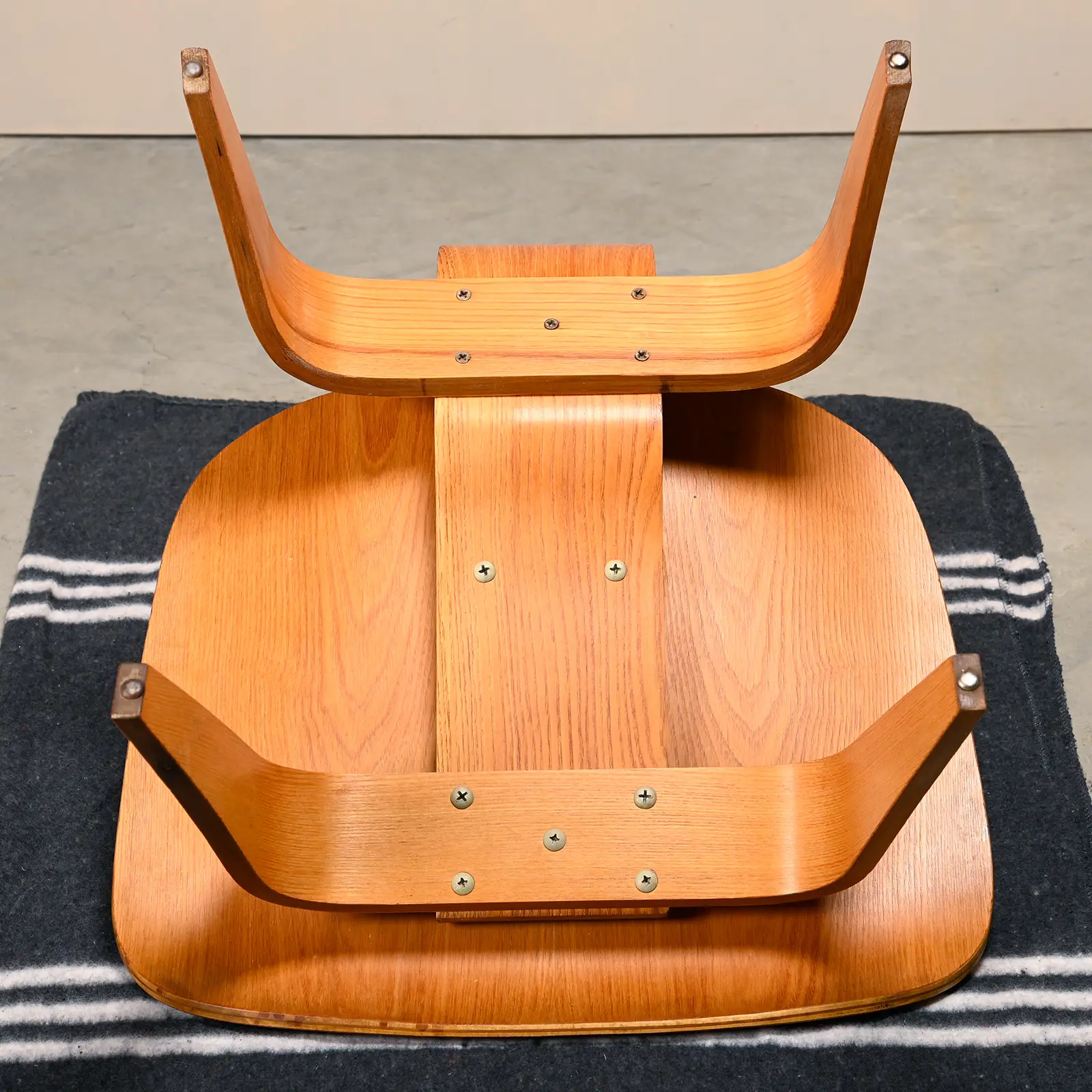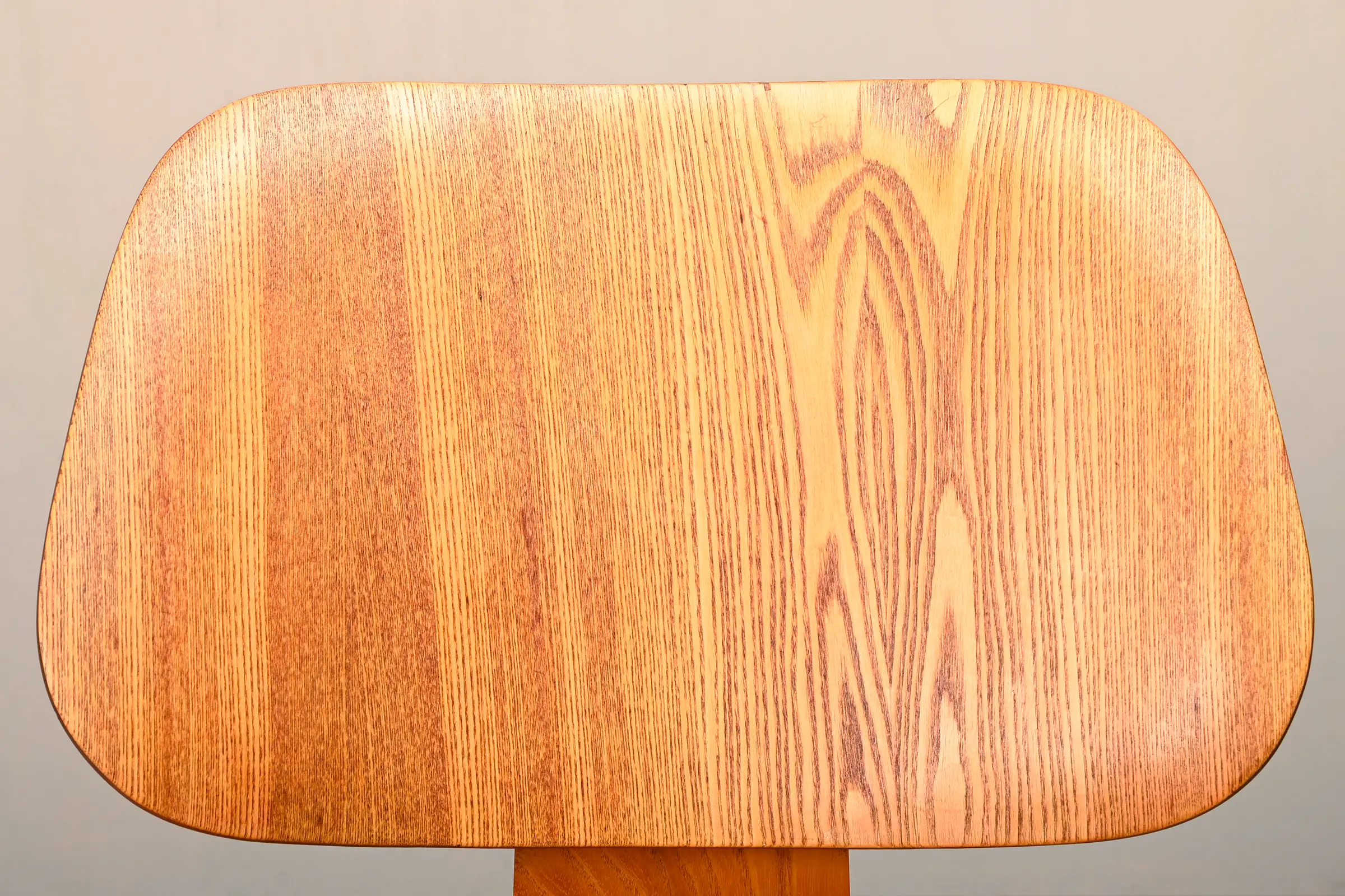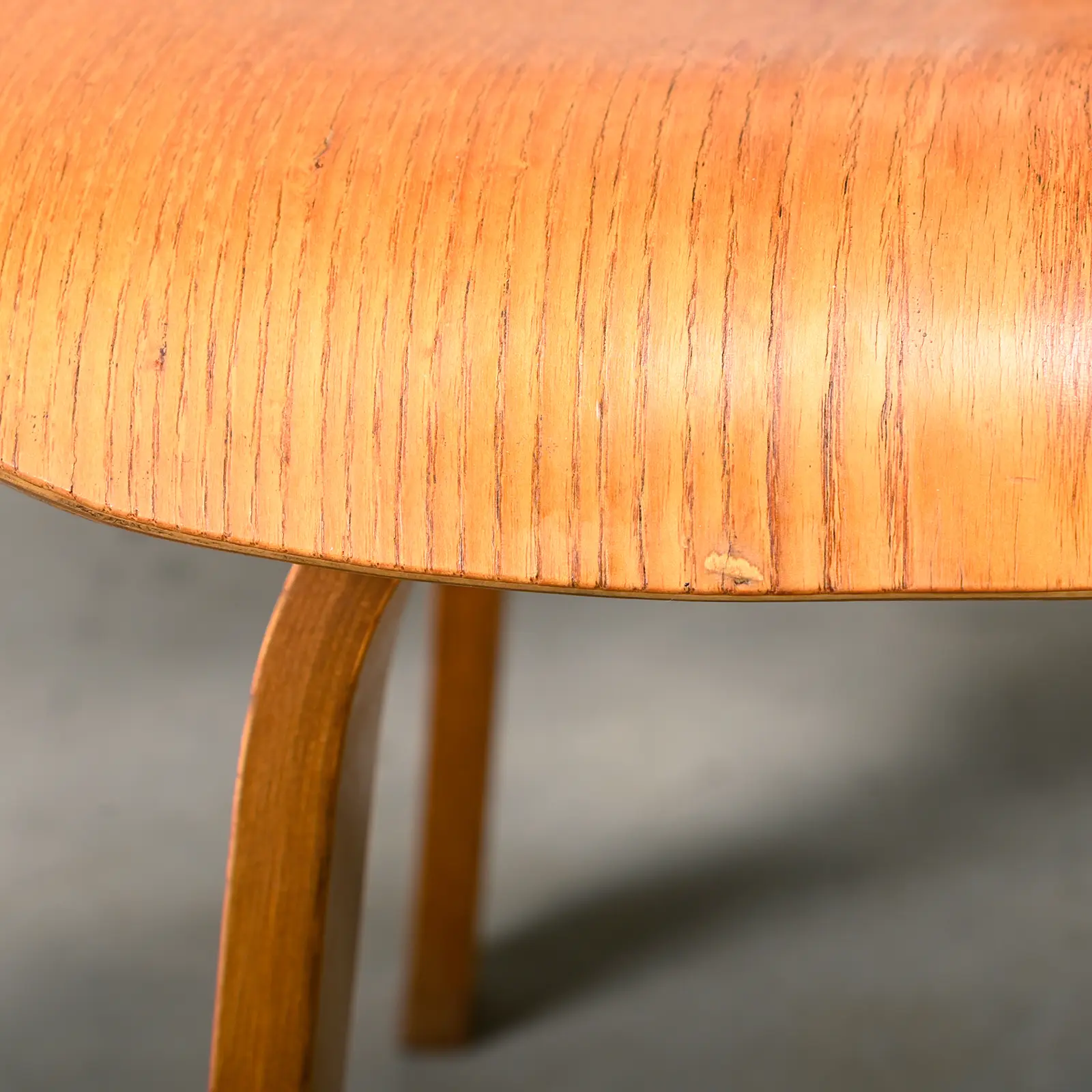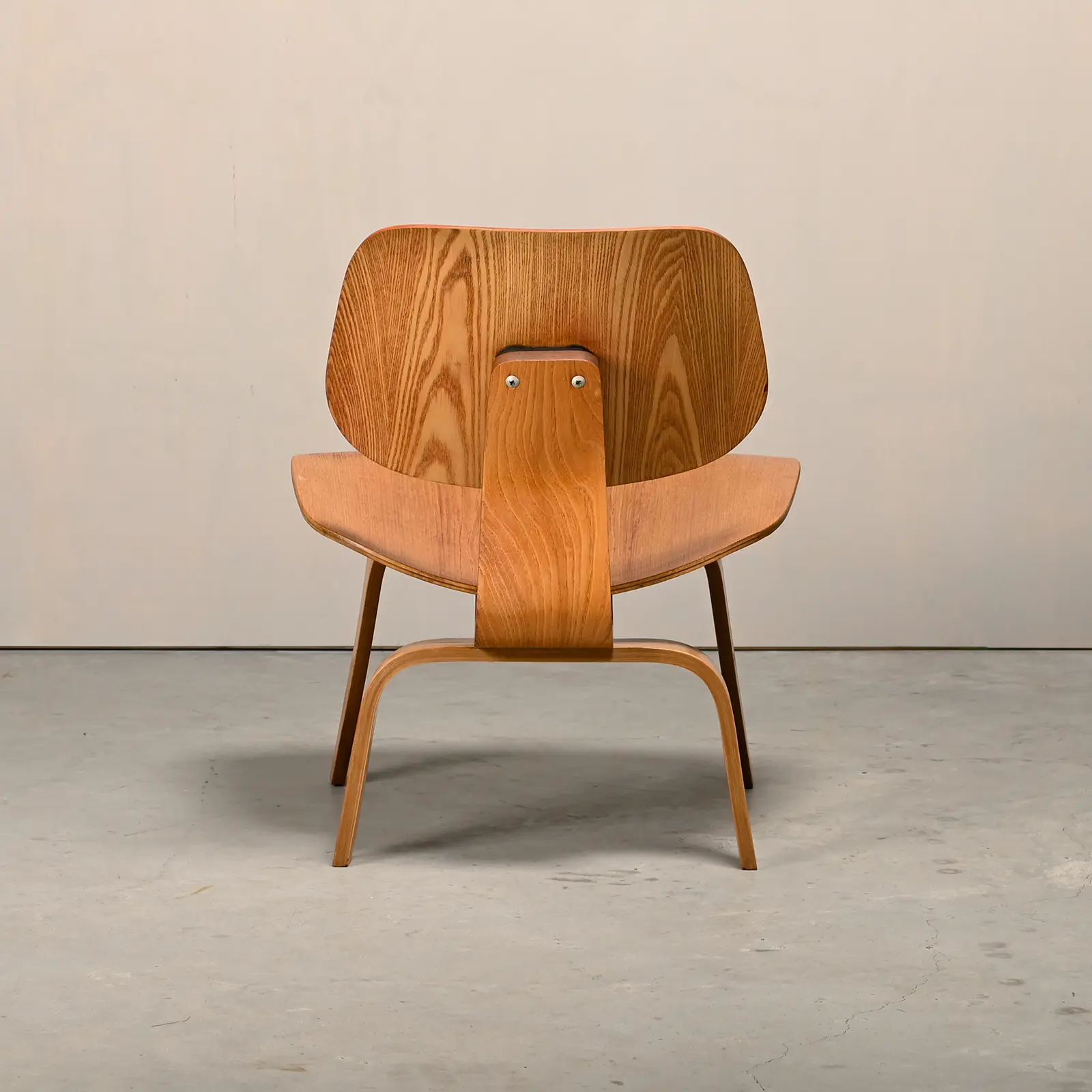 Iconic Charles & Ray Eames LCW lounge chair in Ash plywood. Early Herman Miller production from the fifties (5-2-5 screw configuration), just after Herman Miller took over production from Evans Products Company, Moulded Plywood division. The chair is in good condition with minor visible wear and ageing (light scratches). The back panel has been restored in the past. Beautiful aged wood grain with warm colour tone.
