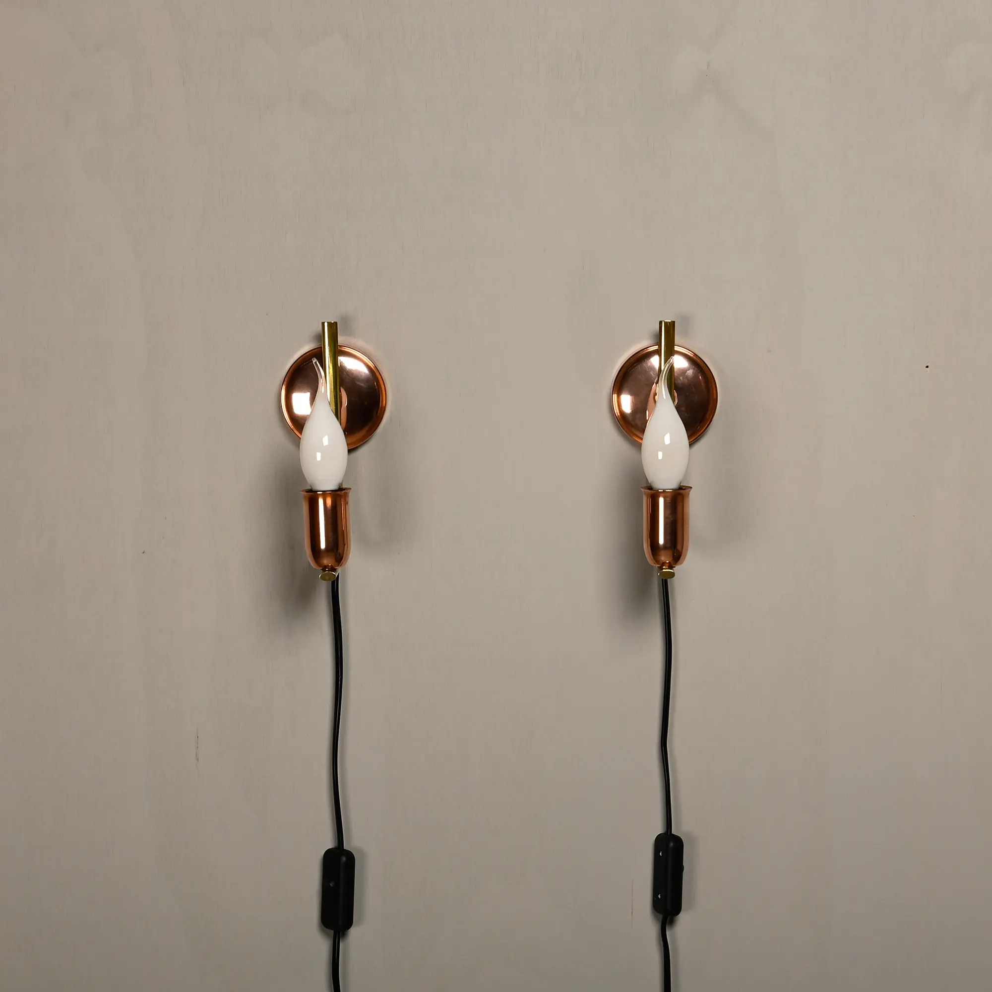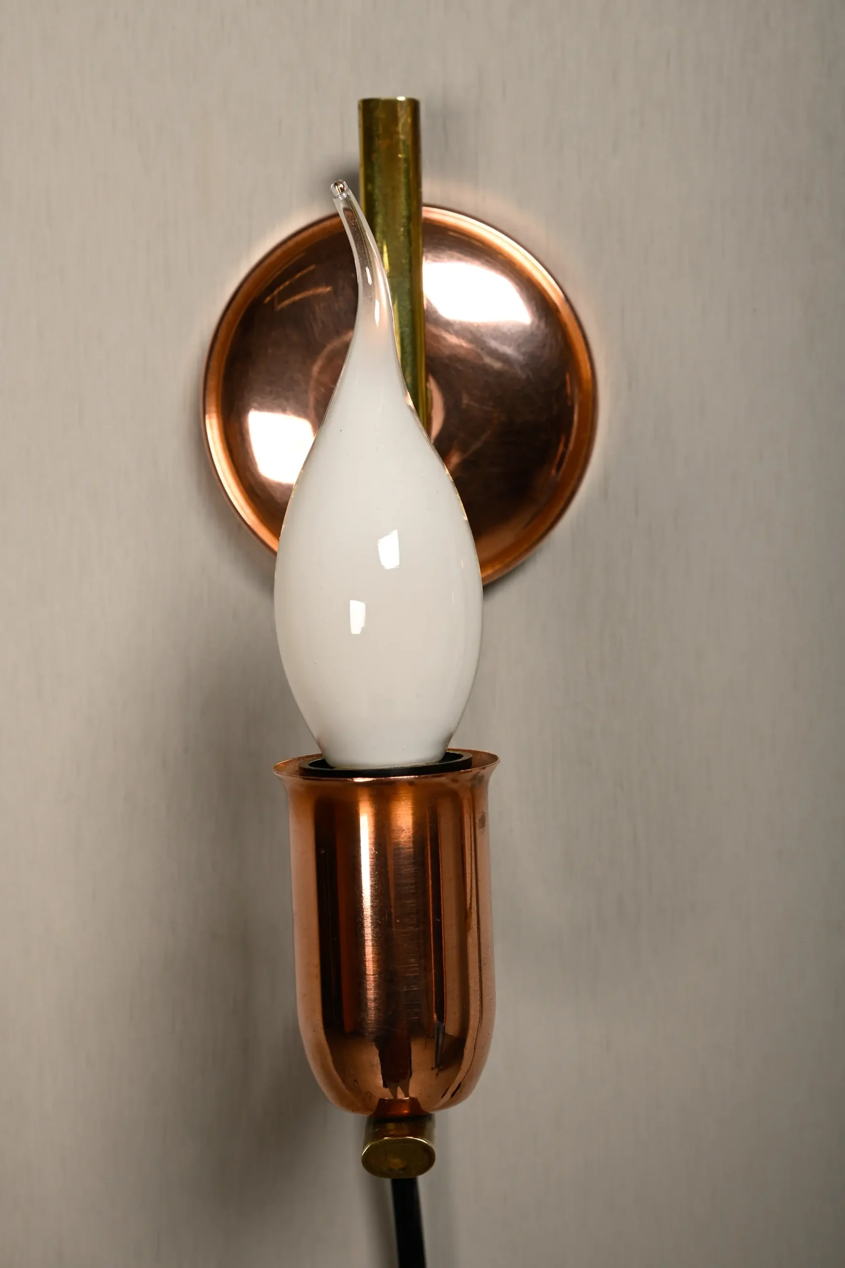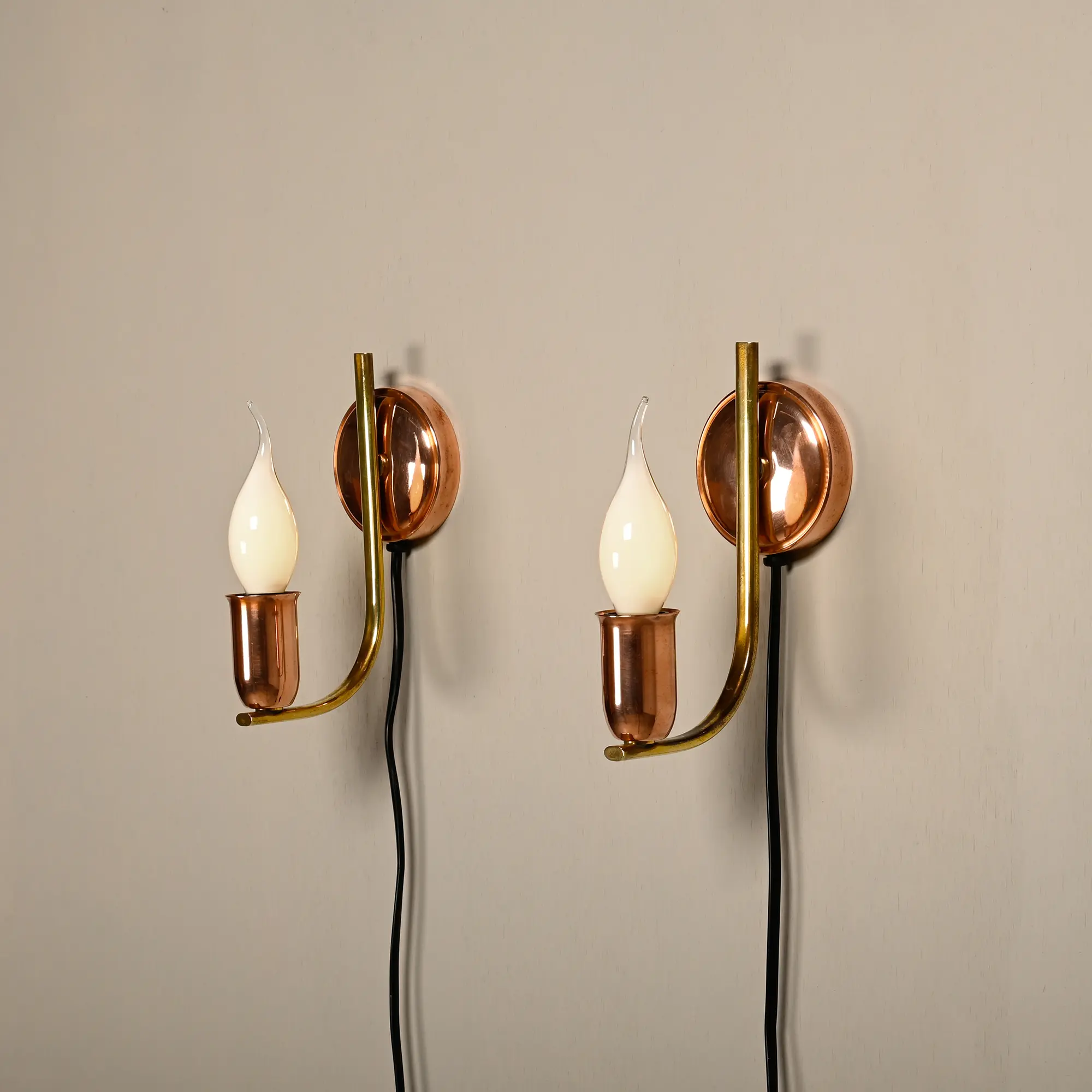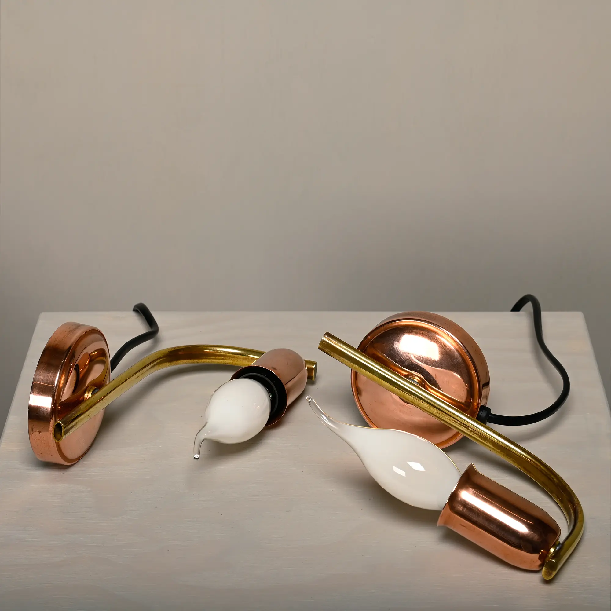 A beautiful pair of vintage wall lamps produced in Denmark in the 1950s. Copper bases and lamp holders are connected by an elegantly curved brass connection. In very good condition, the metal parts have been polished and the lamps rewired. The lamps can be used with either a cord (EU or US plug) or hard-wired.
