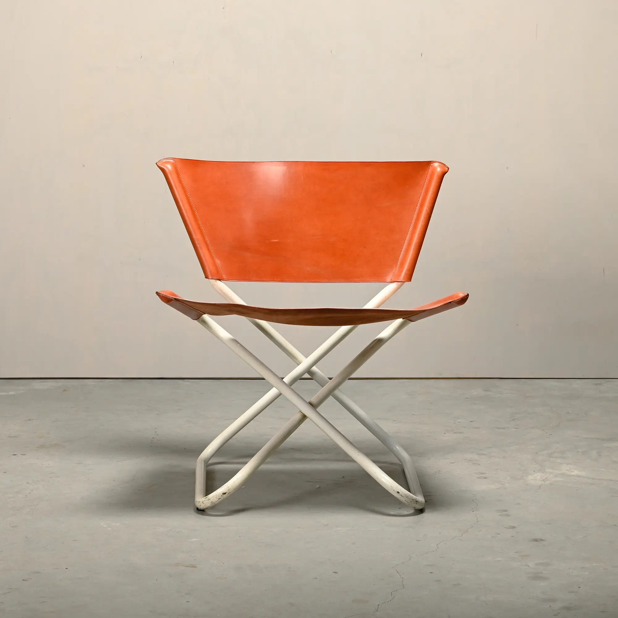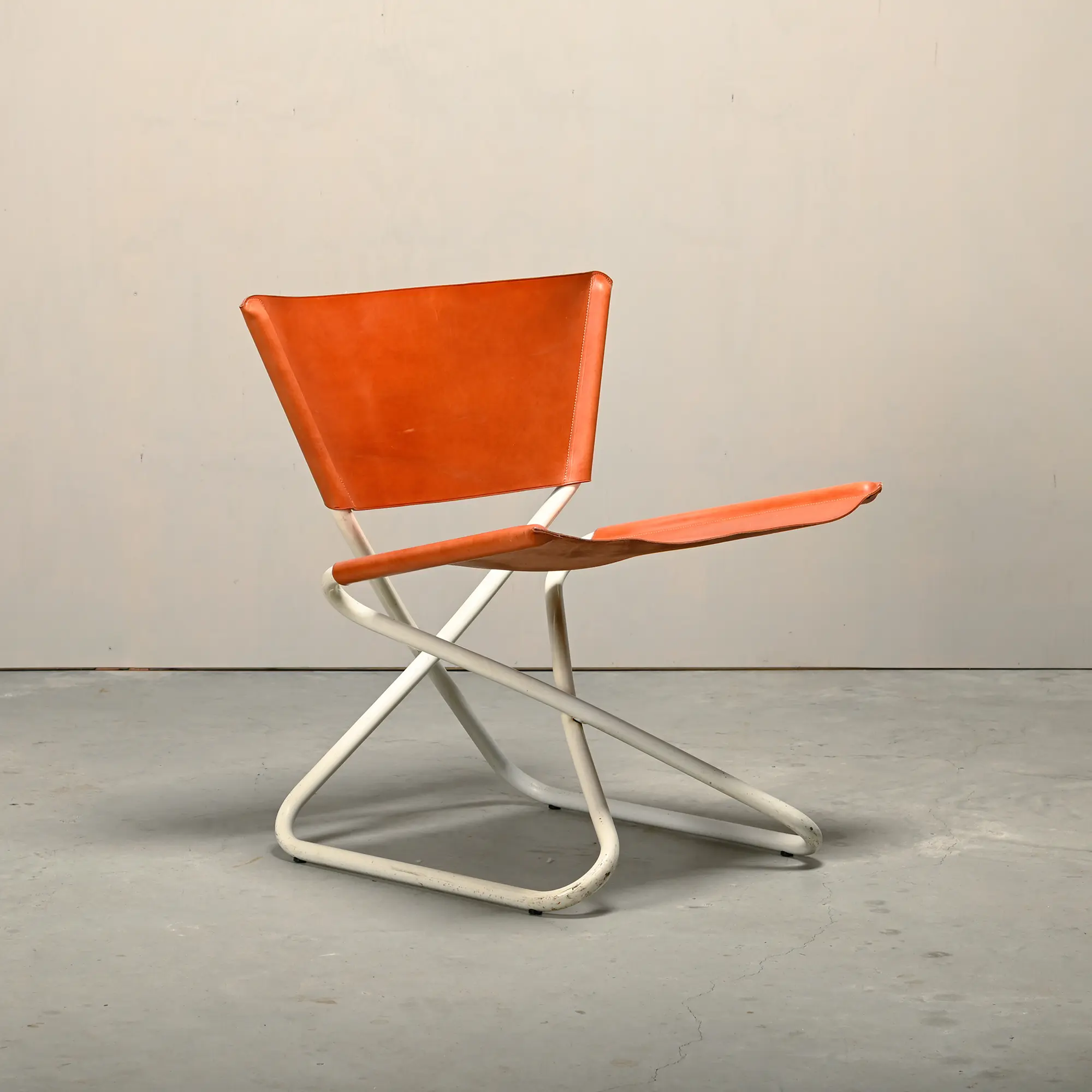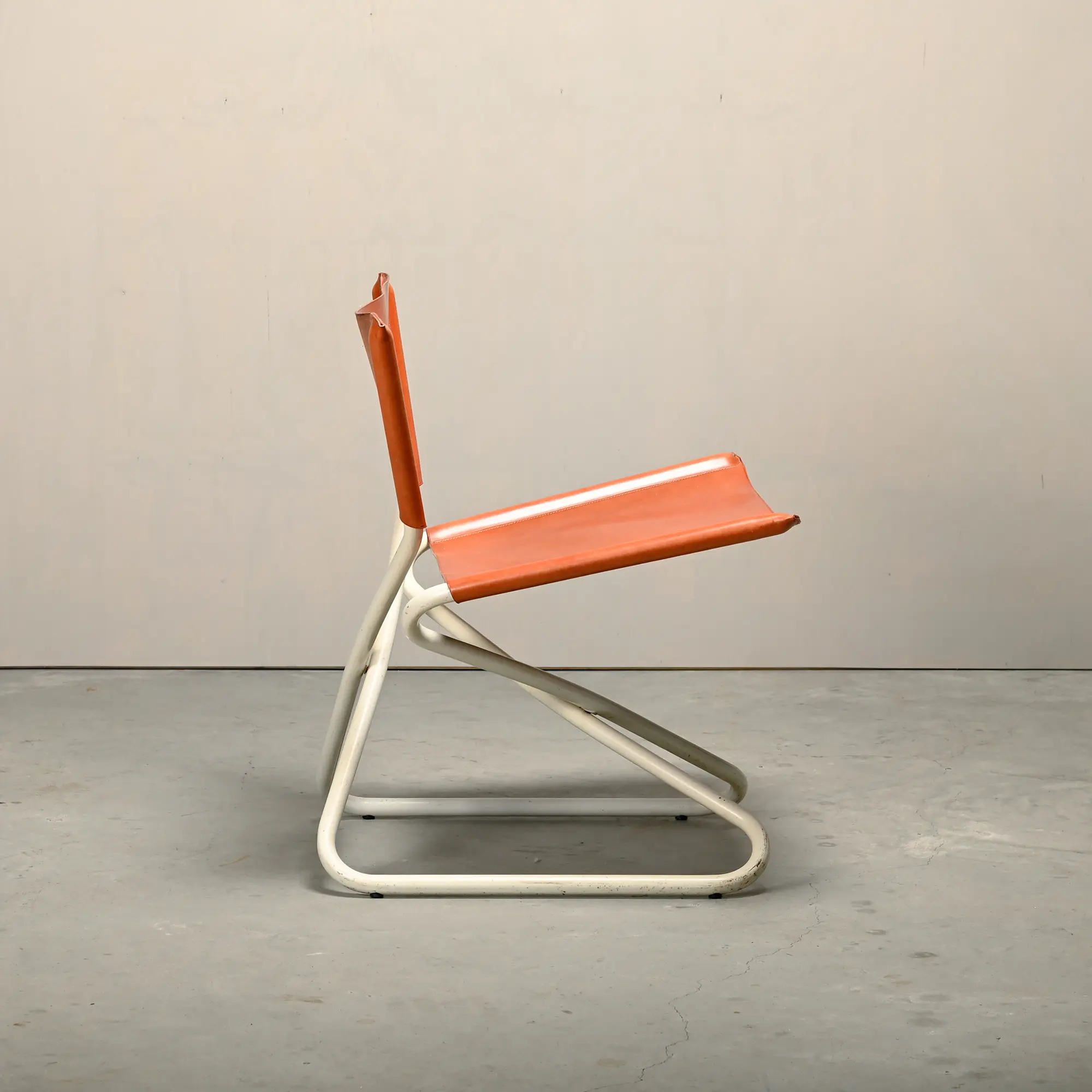 Erik Magnussen Z Down folding lounge chair for Torben Ørskov, Denmark, 1960s. Clever design with a surprisingly comfortable seat. White enameled steel with saddle leather seat and back. Good condition with light patina and signs of wear, primarily on the frame.