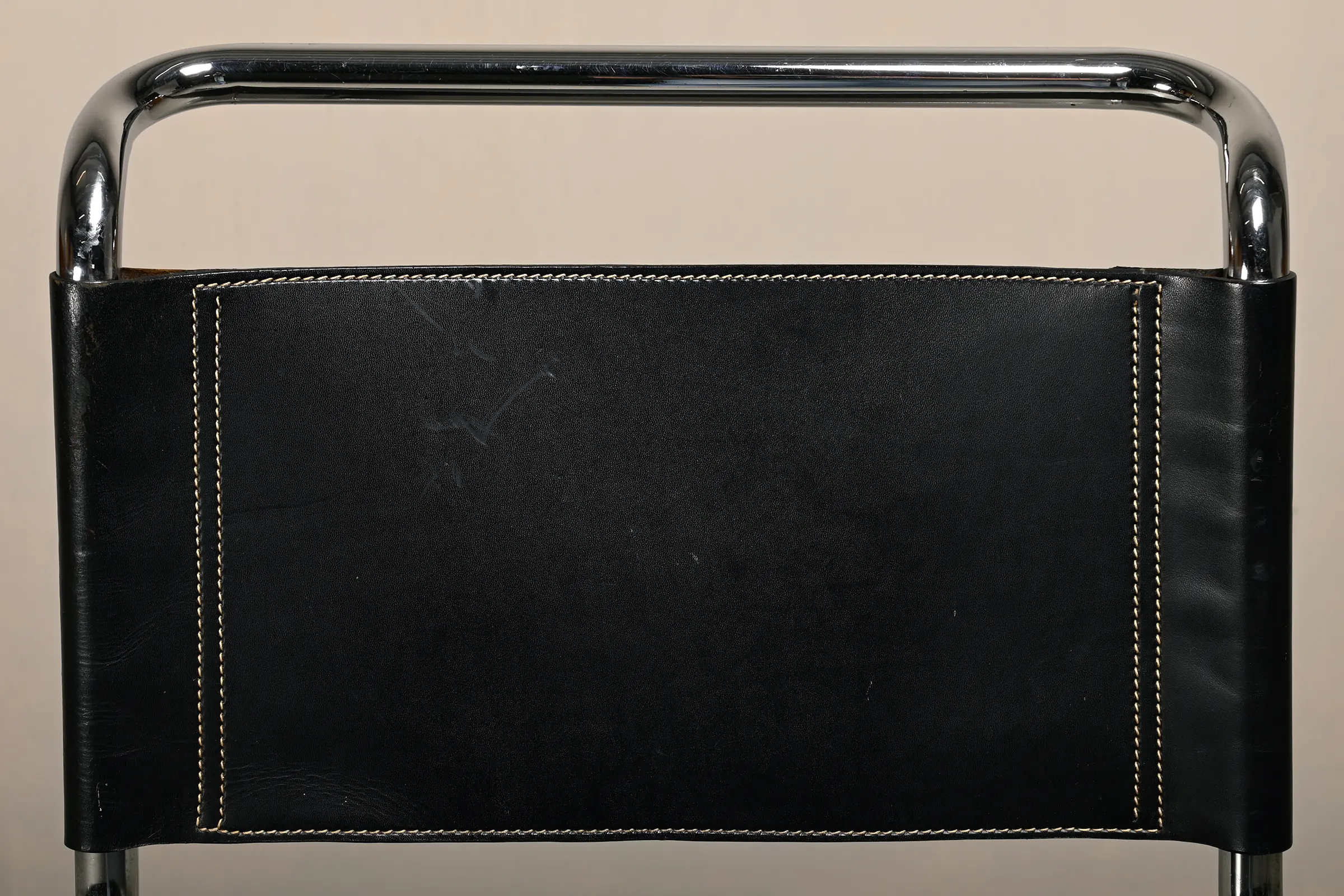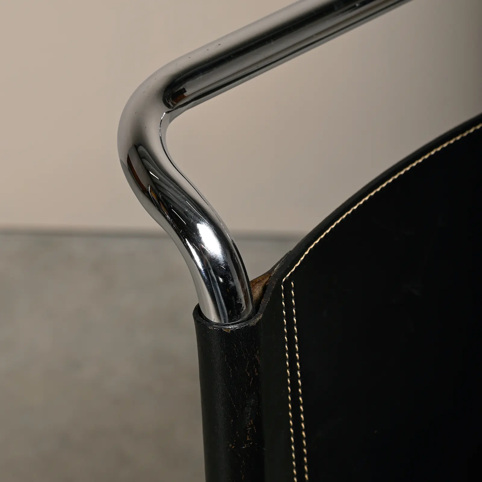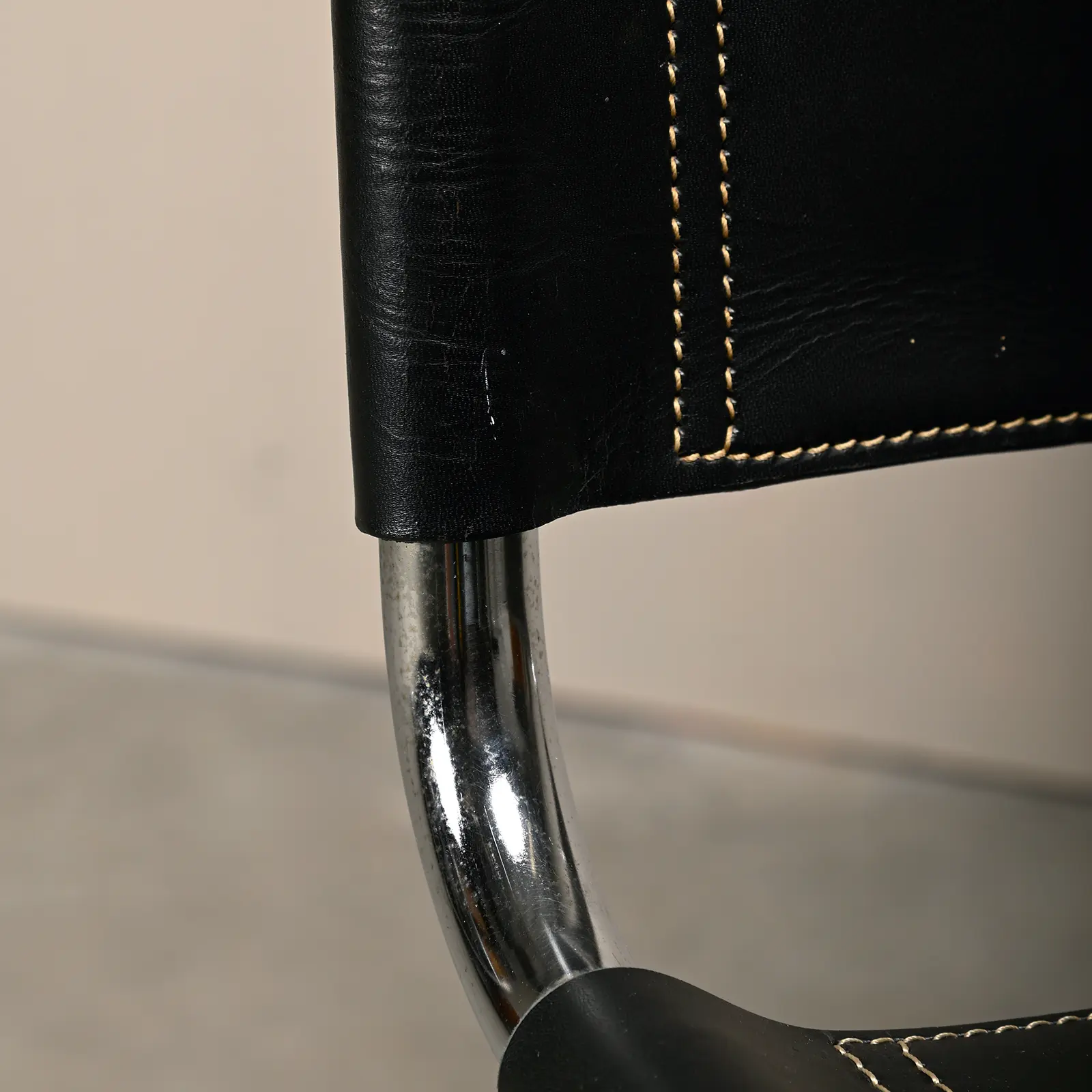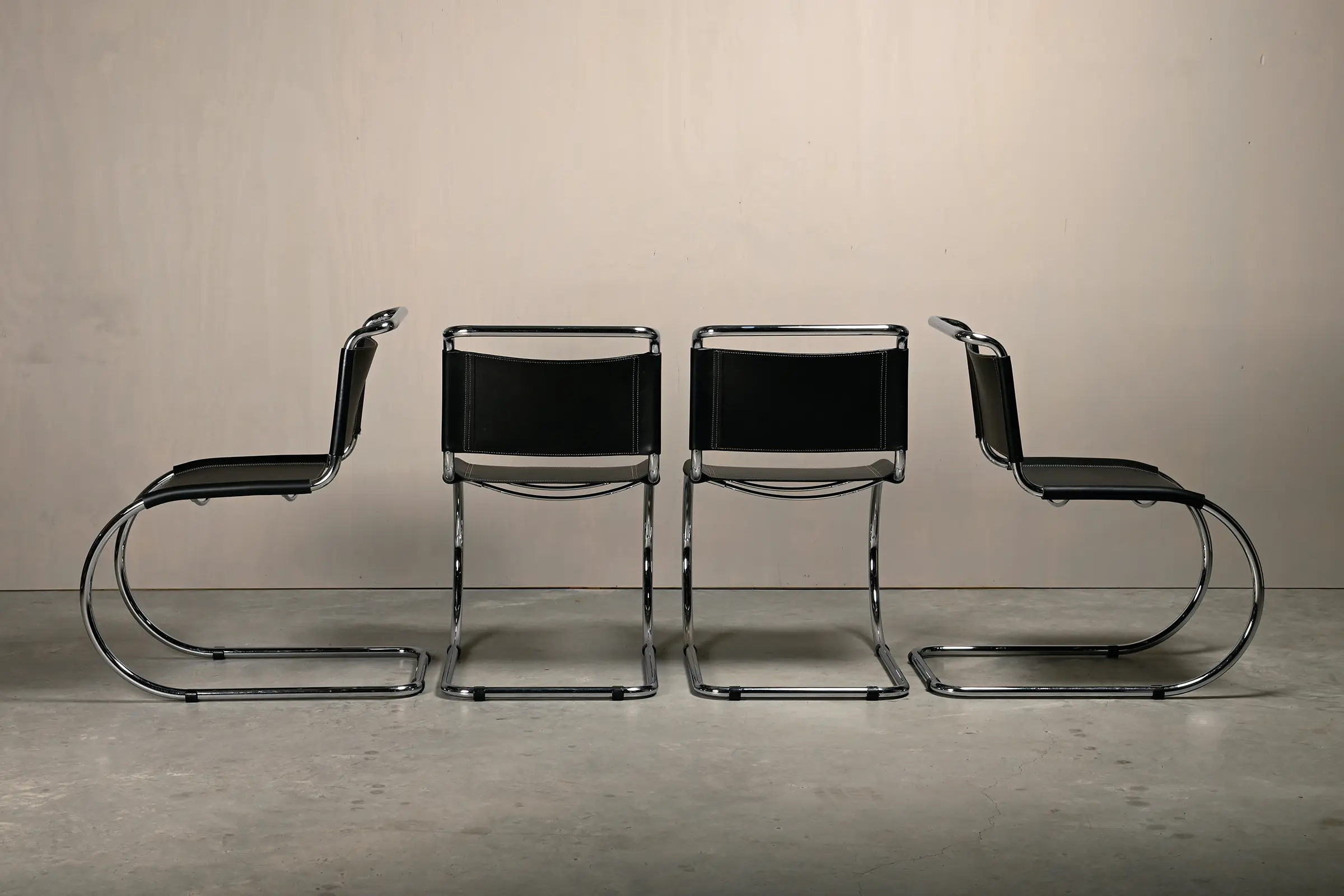 Iconic set of MR 10 (256CS) Cantilever dining chairs designed by Mies van der Rohe for Fasem, Italy. Chrome plated steel tubular frames with black coloured seats and backrest in saddle leather. The leather is in very good condition, not dried out and still souple. Still functioning very well for support when sitting. The chrome plated frames have minor wear.