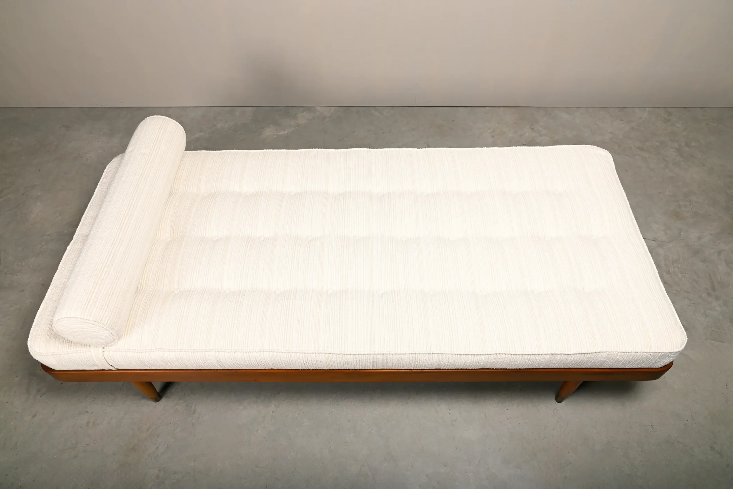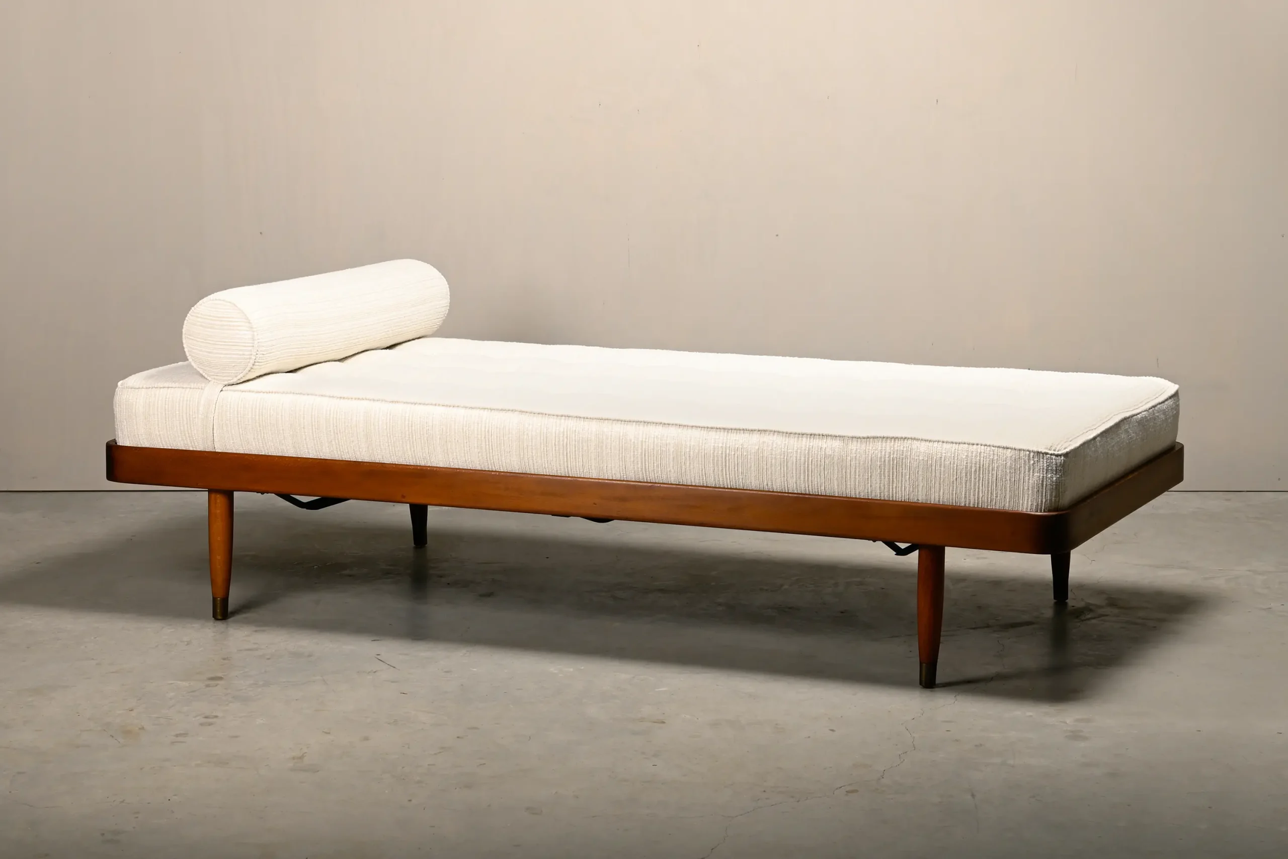 Scandinavian sofa bed, produced by Horsens Møbelfabrik Denmark in the 1960s. The dark-stained wooden frame is in good condition with minor signs of wear. The frame features beautiful details such as rounded corners and tapered legs with brass feet. Beautiful minimalist lines, characteristic of Danish design. The new mattress with neck cushion is upholstered in high-quality striped fabric. The mattress is very comfortable thanks to the spring support in the bed base.